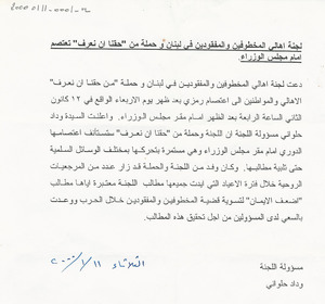 لجنة أهالي المخطوفين والمفقودين: الدولة اللبنانية مسؤولة عن العثور على الضحايا وتحديد مصيرهم