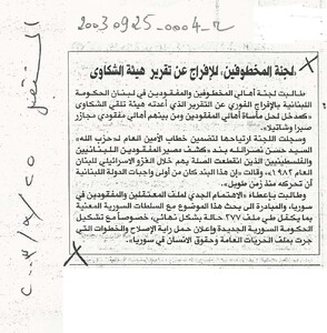 لجنة المخطوفين تدعو الى نبش كل المقابر ووقف المتاجرة السياسية وجعجع يطالب بتحقيق دولي، ميليس يودع لبنان: اكتمال التحقيق سيستغرق سنوات، استجوابات فيينا تستكمل اليوم وترجح الانتقال الى مرحلة الاشتباه