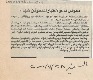 معوض طالبت الحكومة باعتبار المخطوفين شهداء حرب