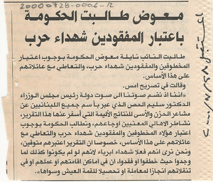 معوض طالبت الحكومة باعتبار المفقودين شهداء حرب