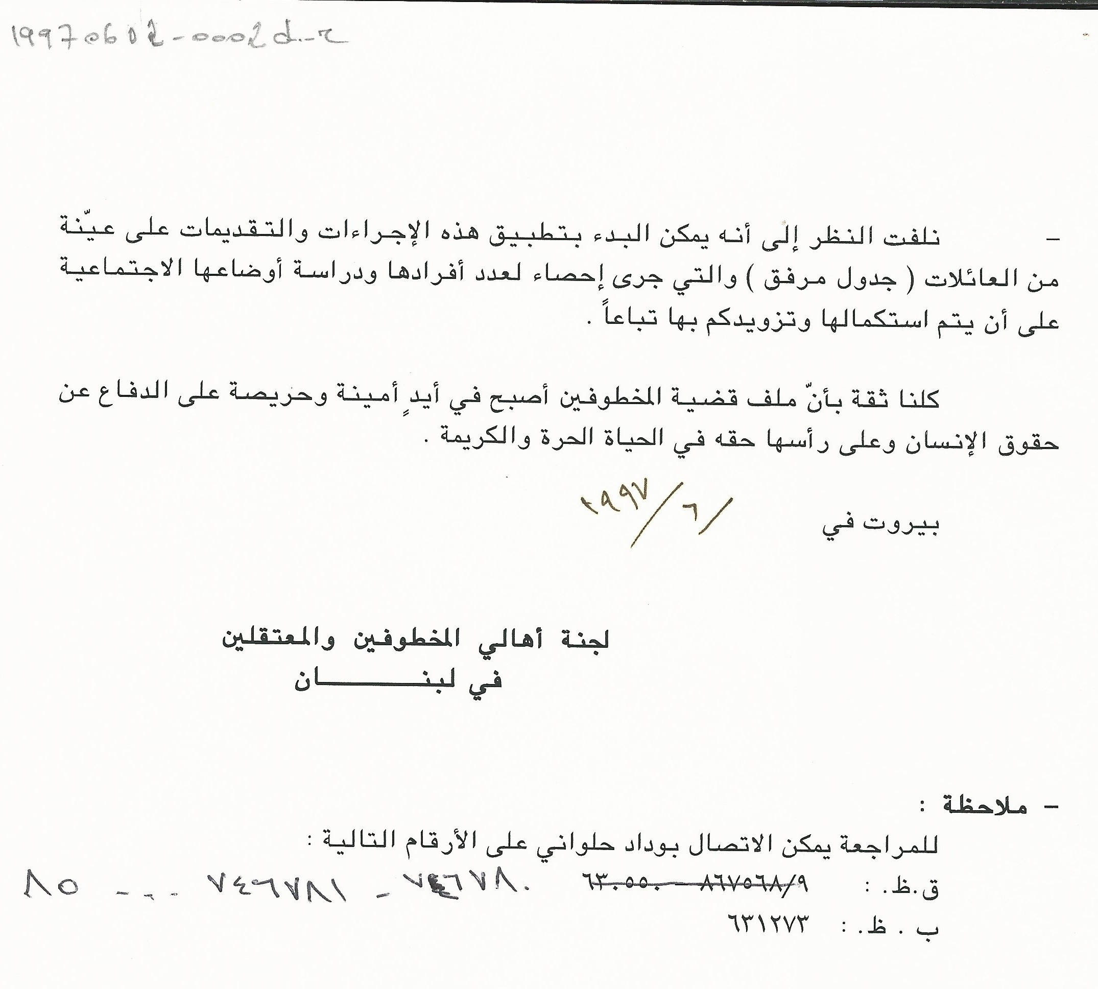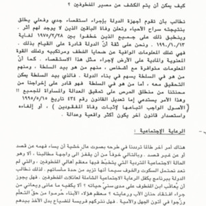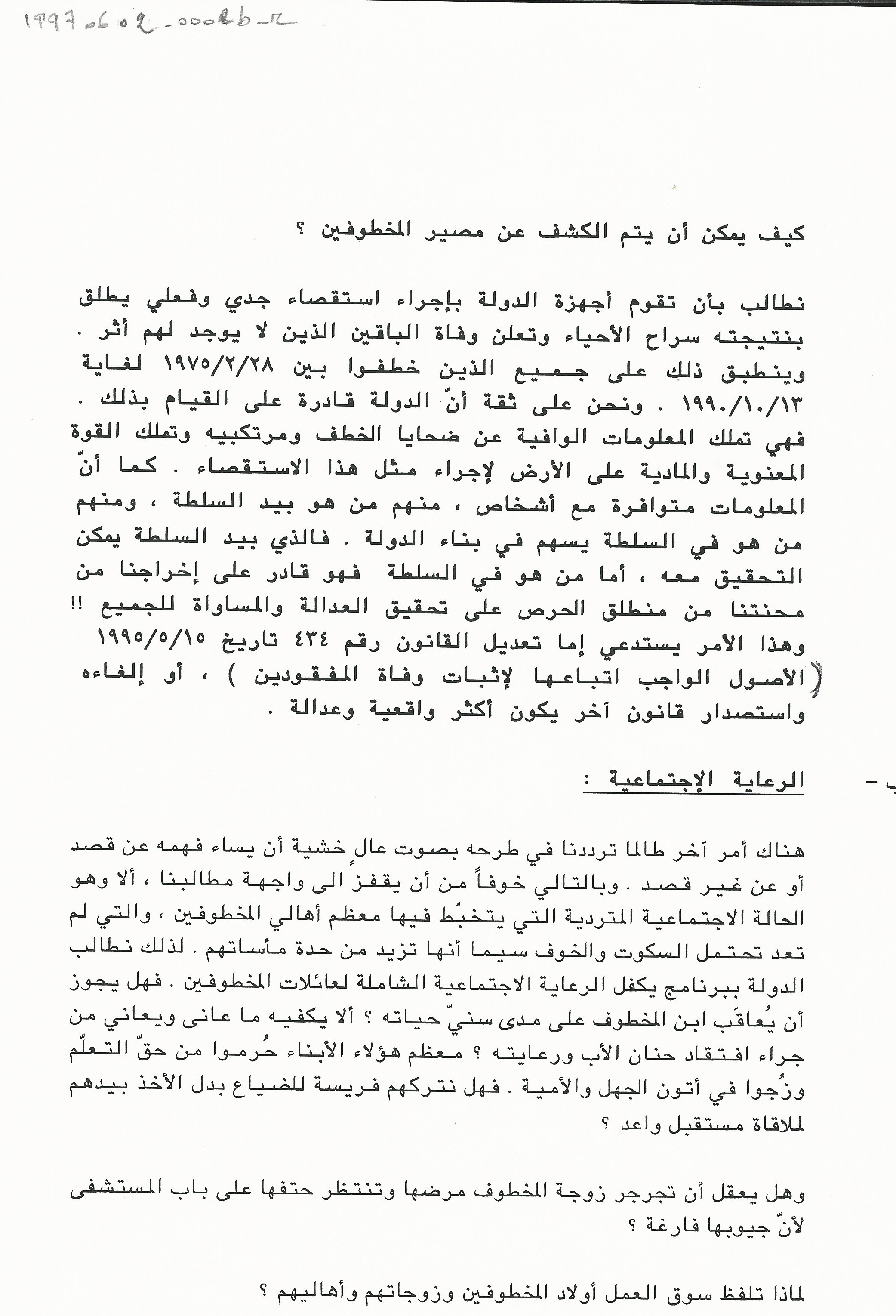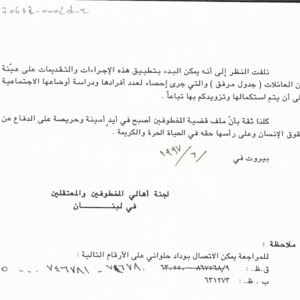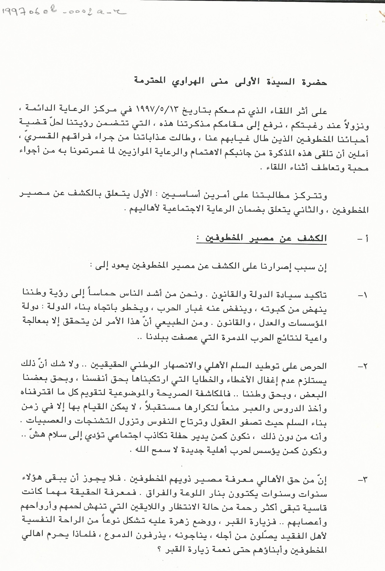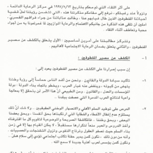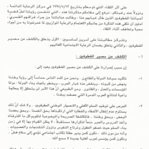 مذكرة الى السيدة الاولى منى الهراوي للمطالبة بالكشف عن مصير المخطوفين وتأمين الرعاية الاجتماعية لعائلاتهم