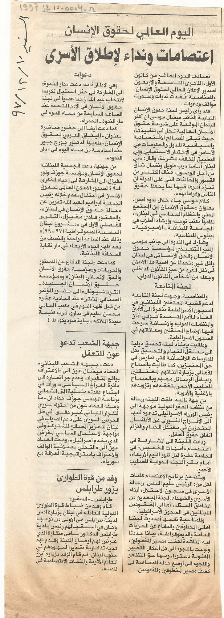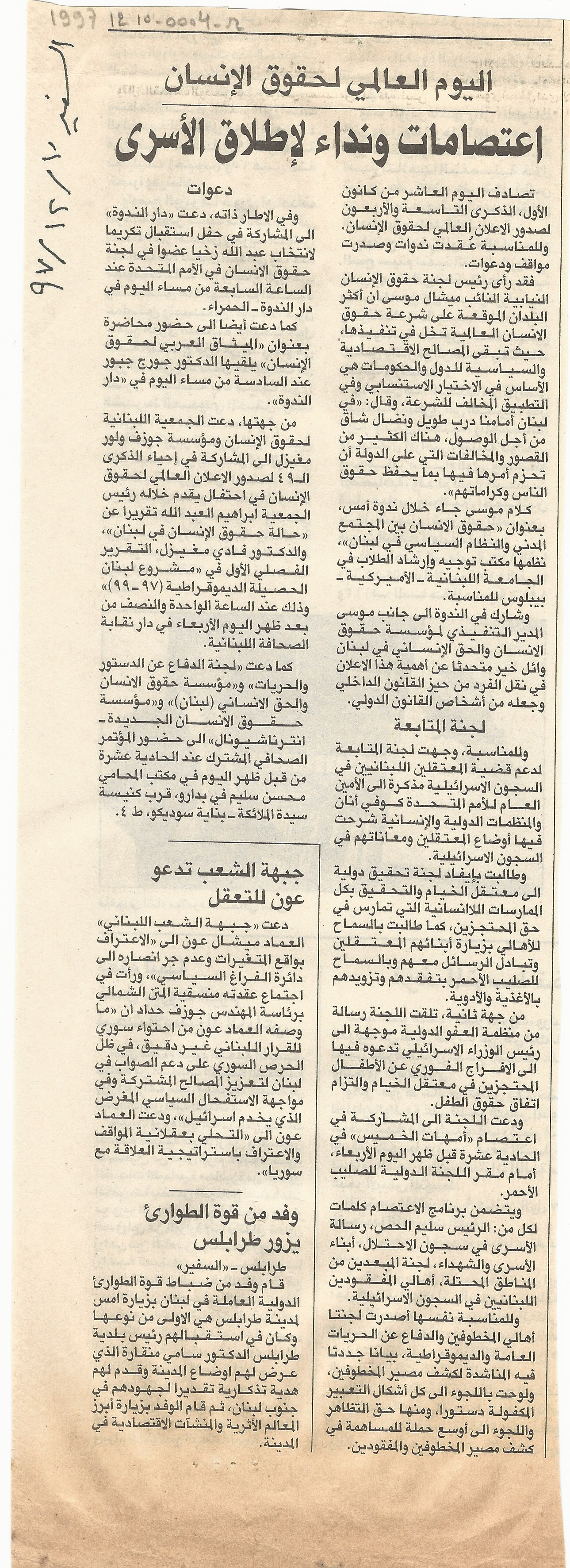 - ar اليوم العالمي لحقوق الانسان اعتصامات ونداء لاطلاق الاسرى