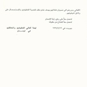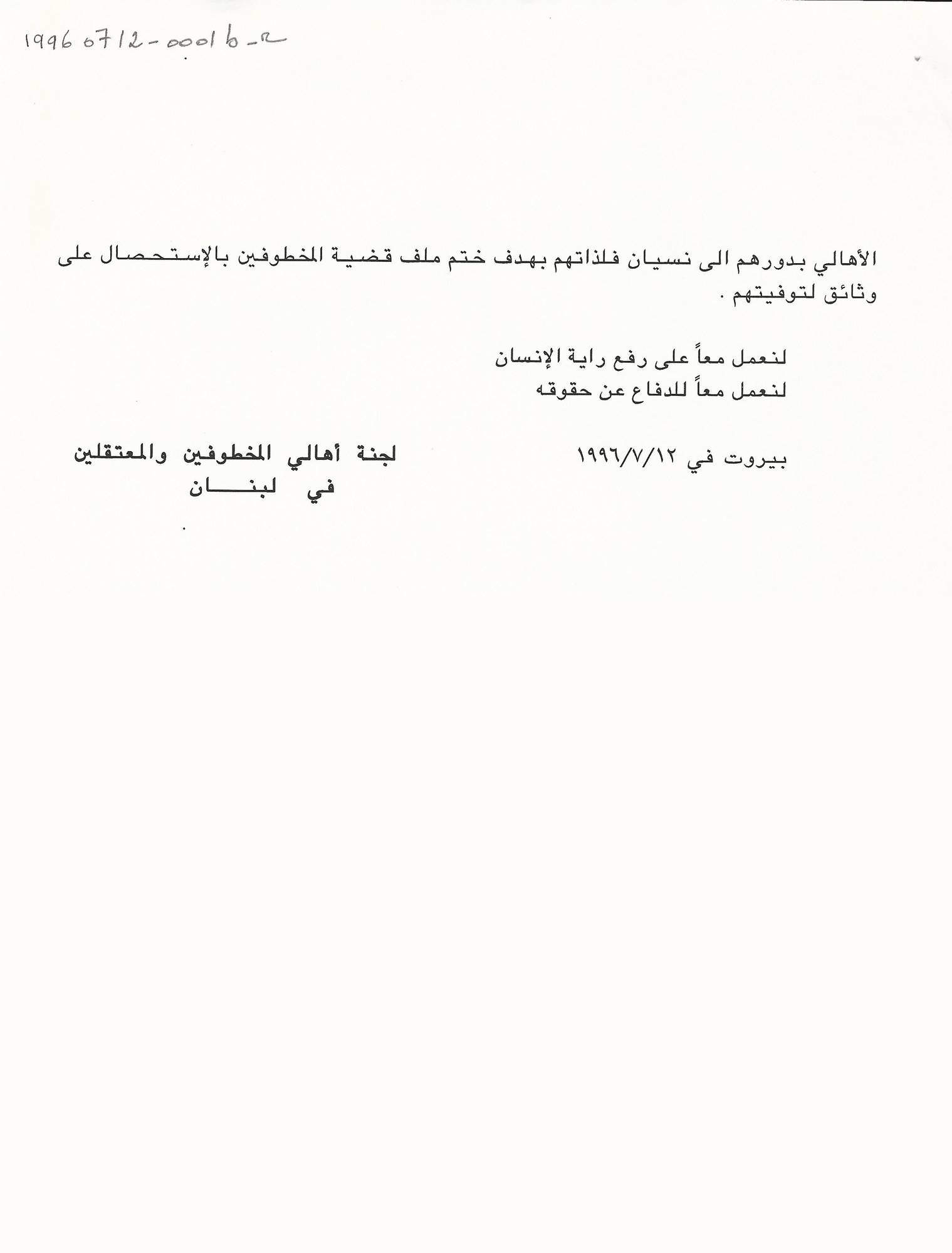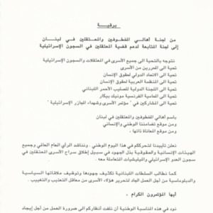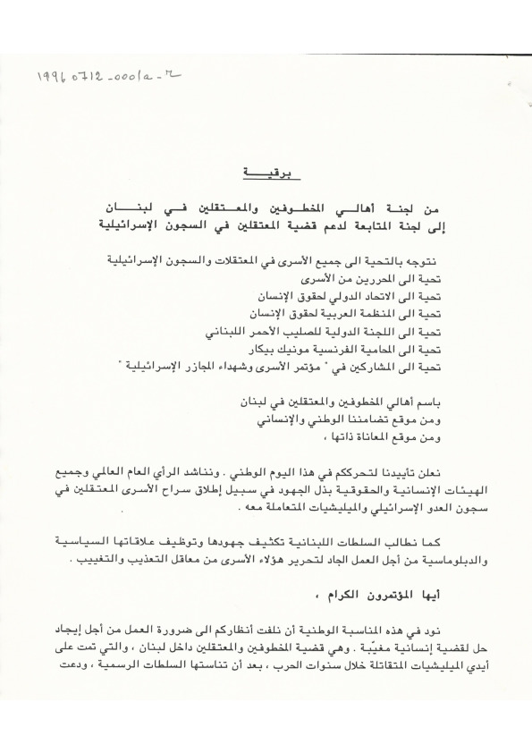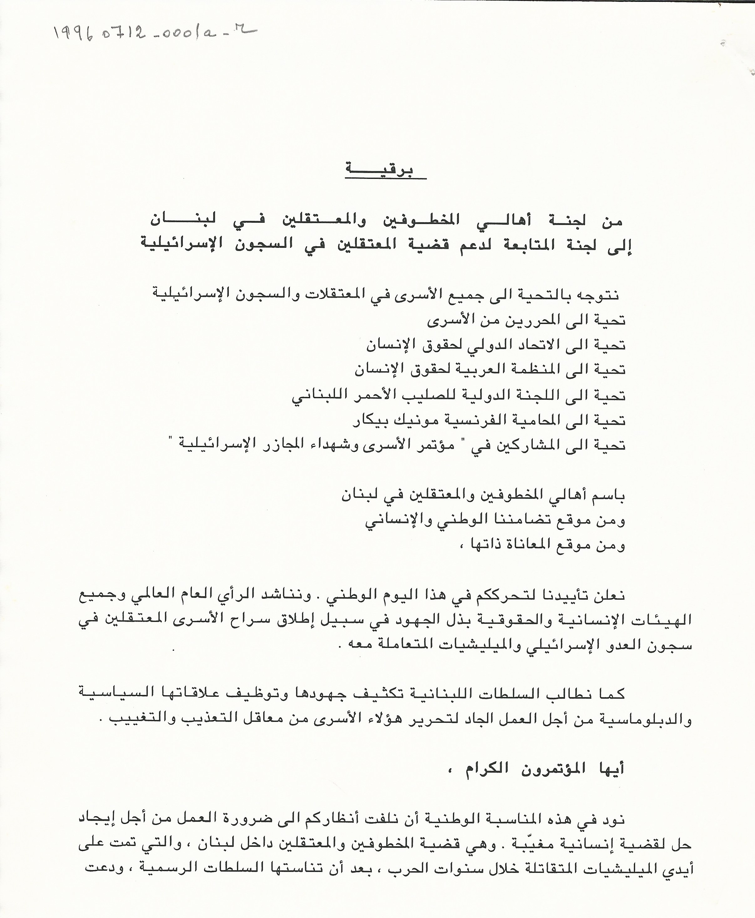 From the Committee of the Families of the Kidnapped and Detained in Lebanon to the Follow-up Committee for the Support of the Issue of the Detained in Israeli Prisons.