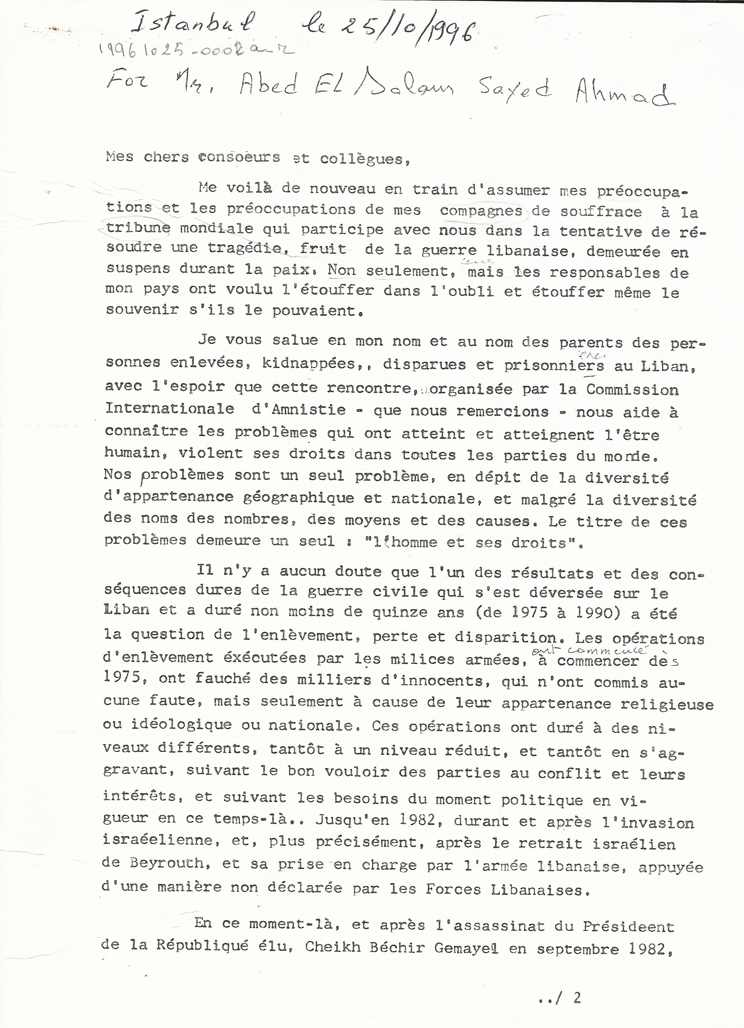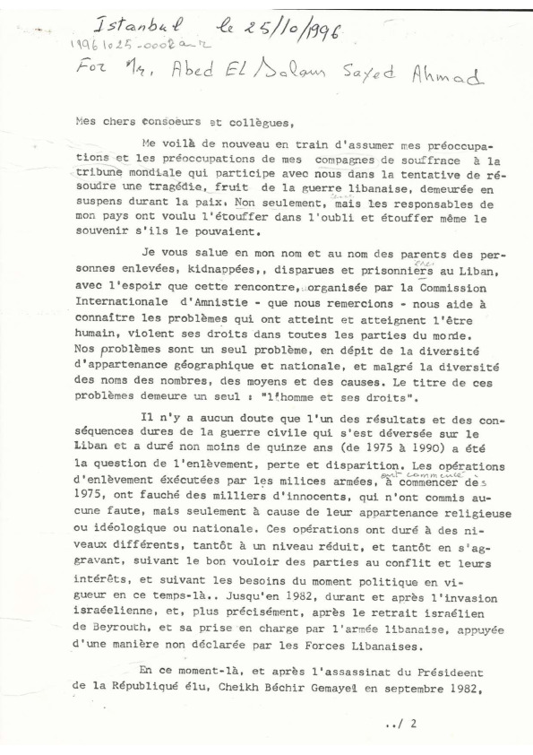 - fr Discours de Wadad Halwani au rassemblement d'Istanboul sous le patronnage de la Commission Internationale d'Amnistie