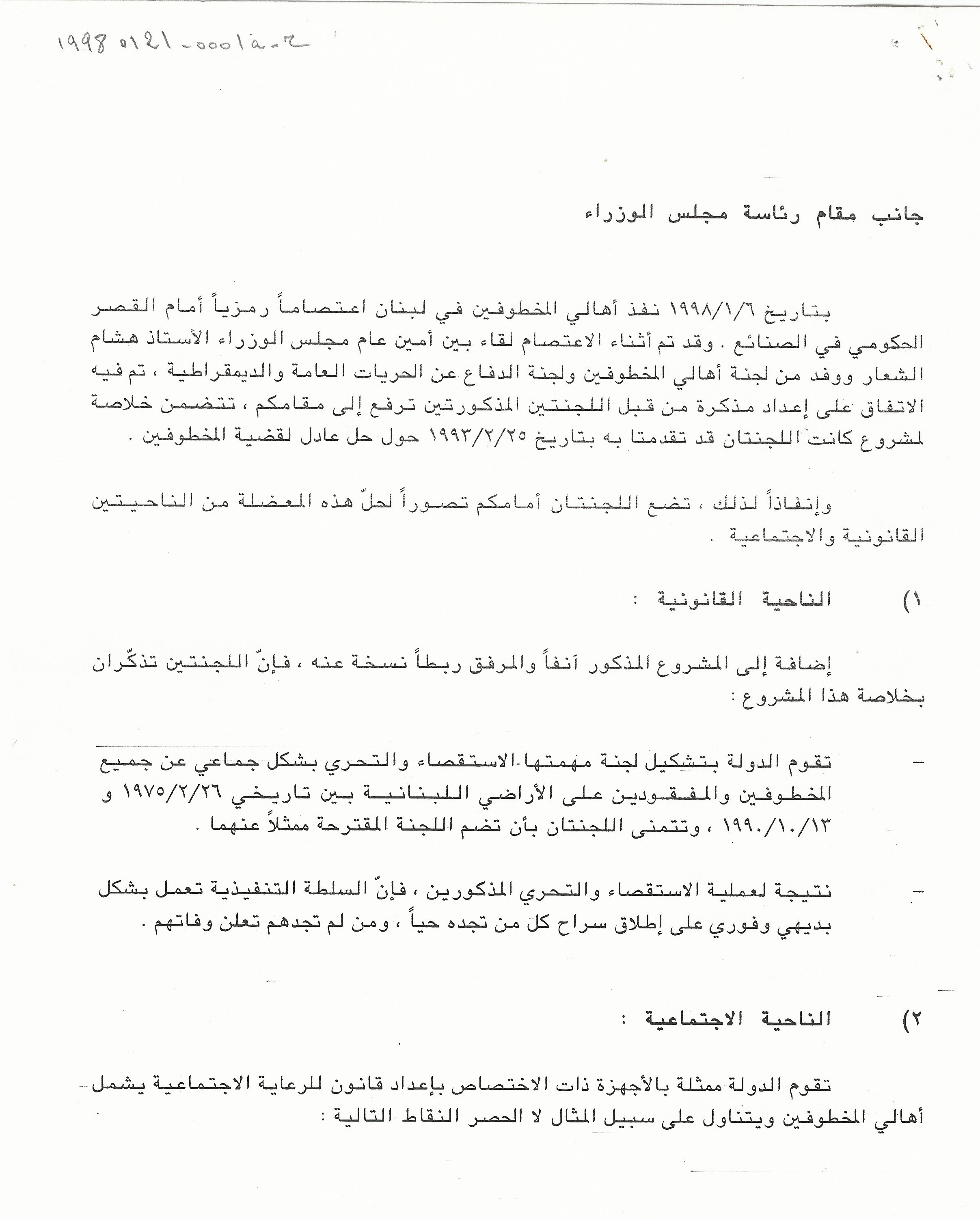لجنة اهالي المخطوفين والمفقودين في لبنان ولجنة الدفاع عن الحريات تتقدم بمشروع حل لقضيتهم الى مجلس الوزراء