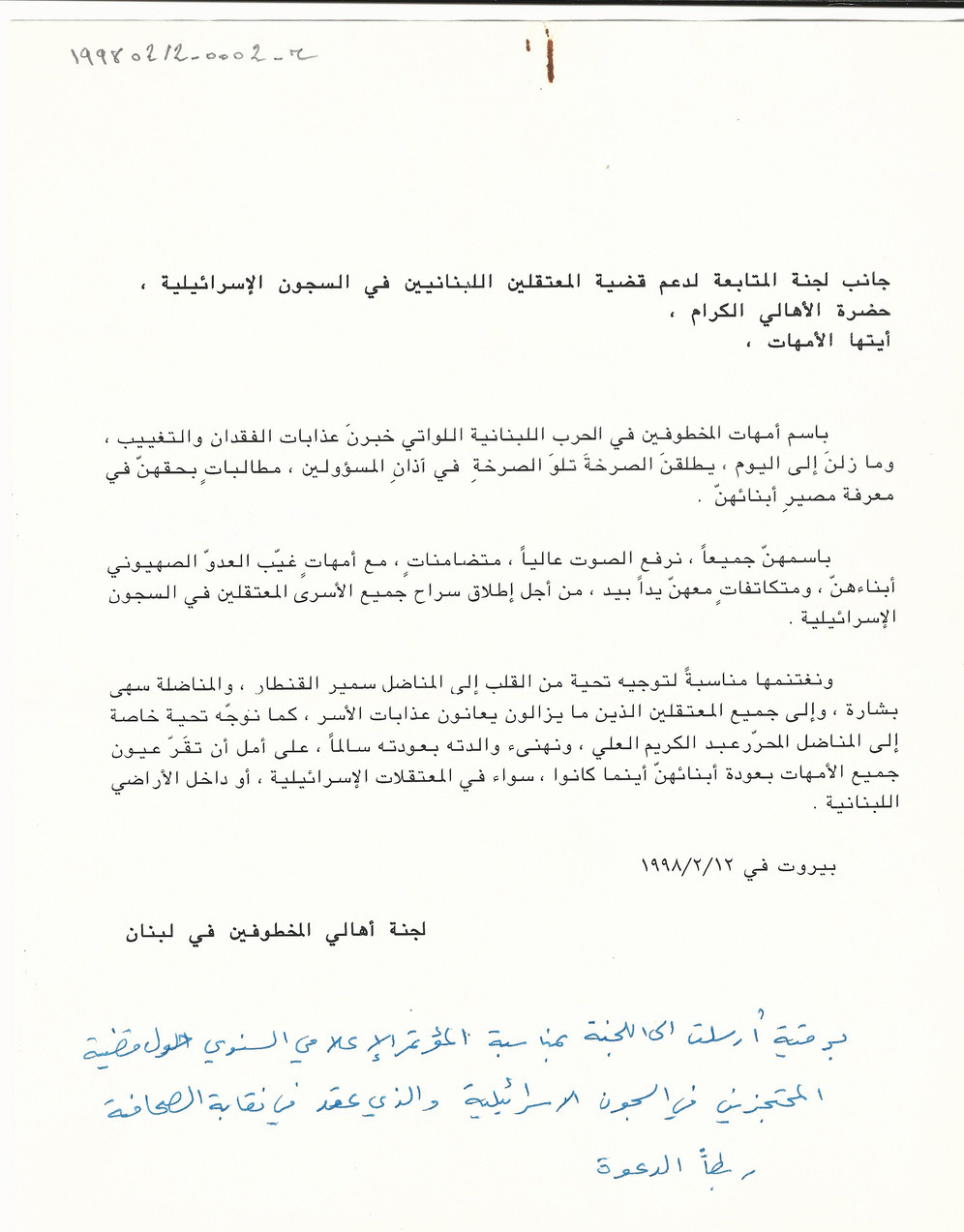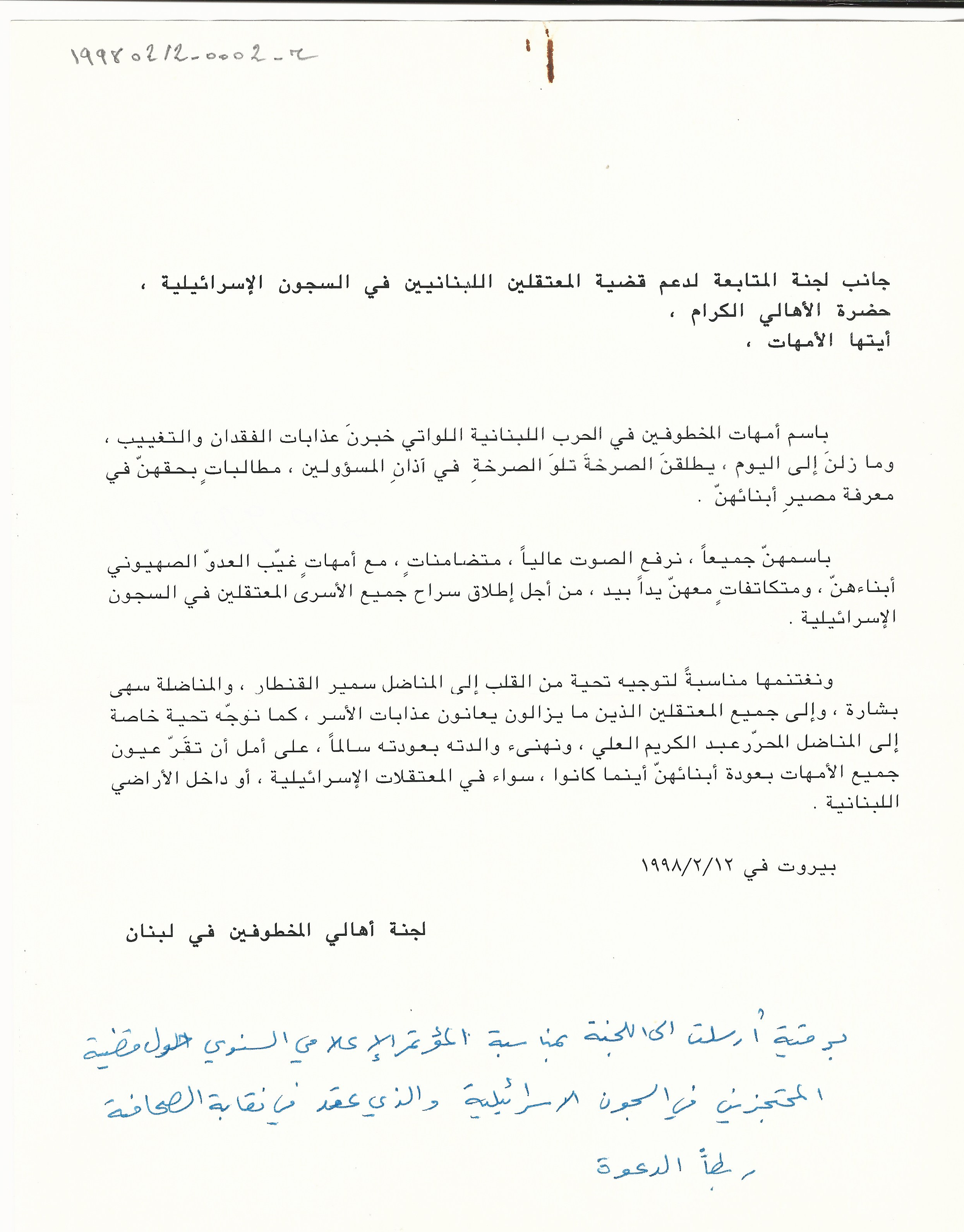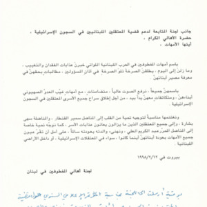 To the Follow-up Committee for the Support of the Issue of Lebanese Detained in the Israeli Prisons