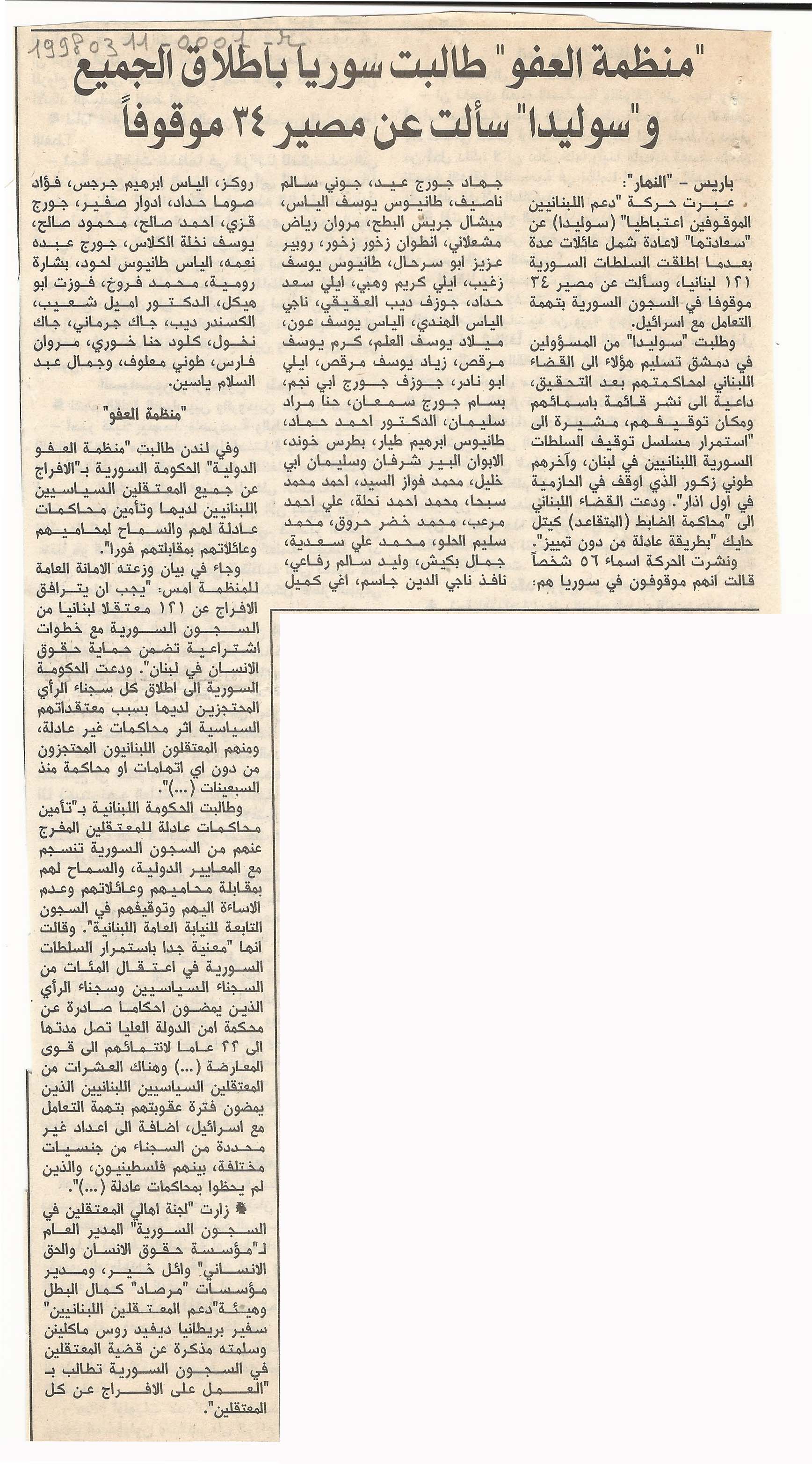 - en Amnesty International demands Syria to release all kidnapped and SOLIDE questions the fate of 34 arrested.