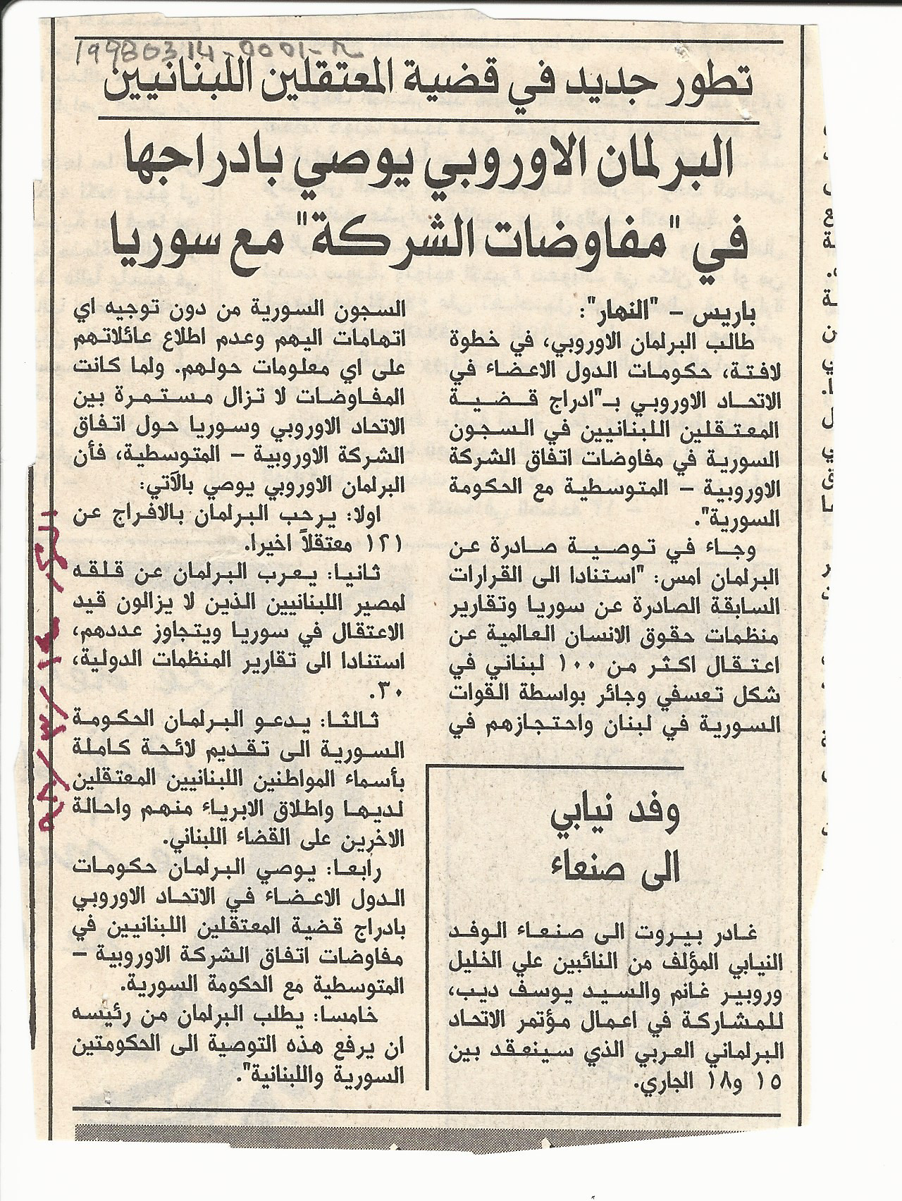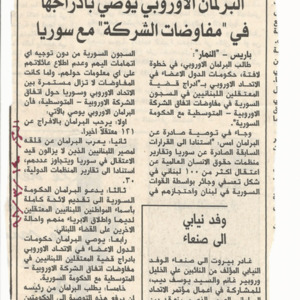 A recent development in the issue of the detained Lebanese: The European Parliament recommends to include it in the Association negotiations with Syria.
