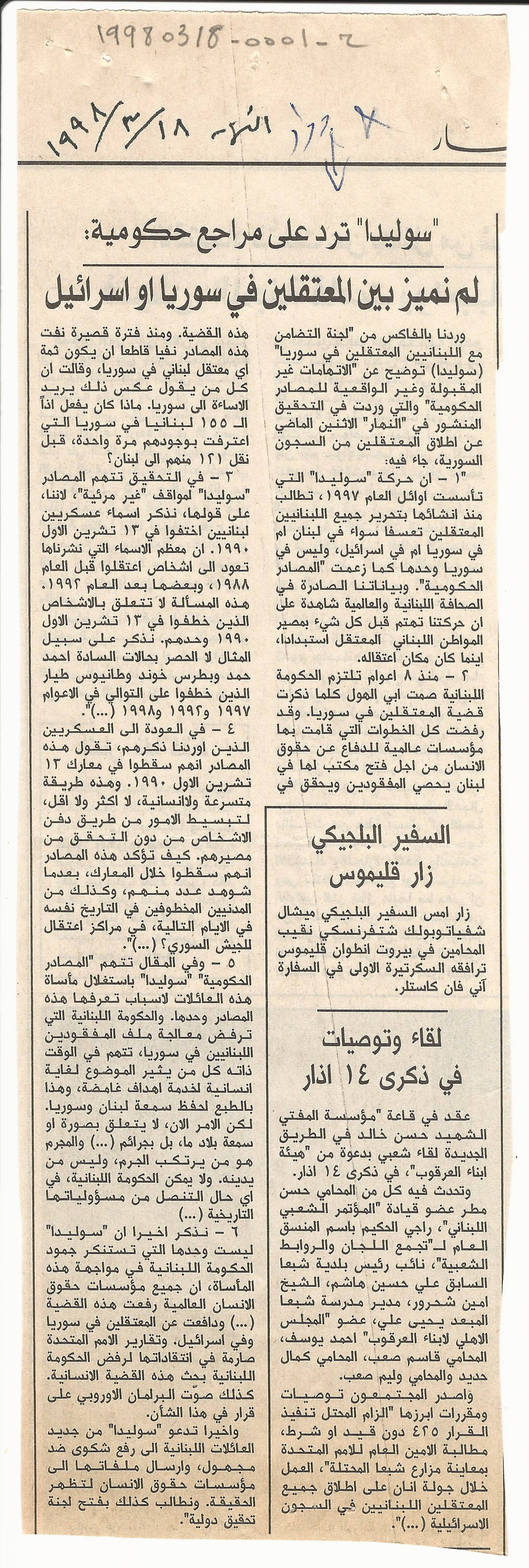 - ar سوليدا ترد على مراجع حكومية: لم نميز بين المعتقلين في سوريا او اسرائيل