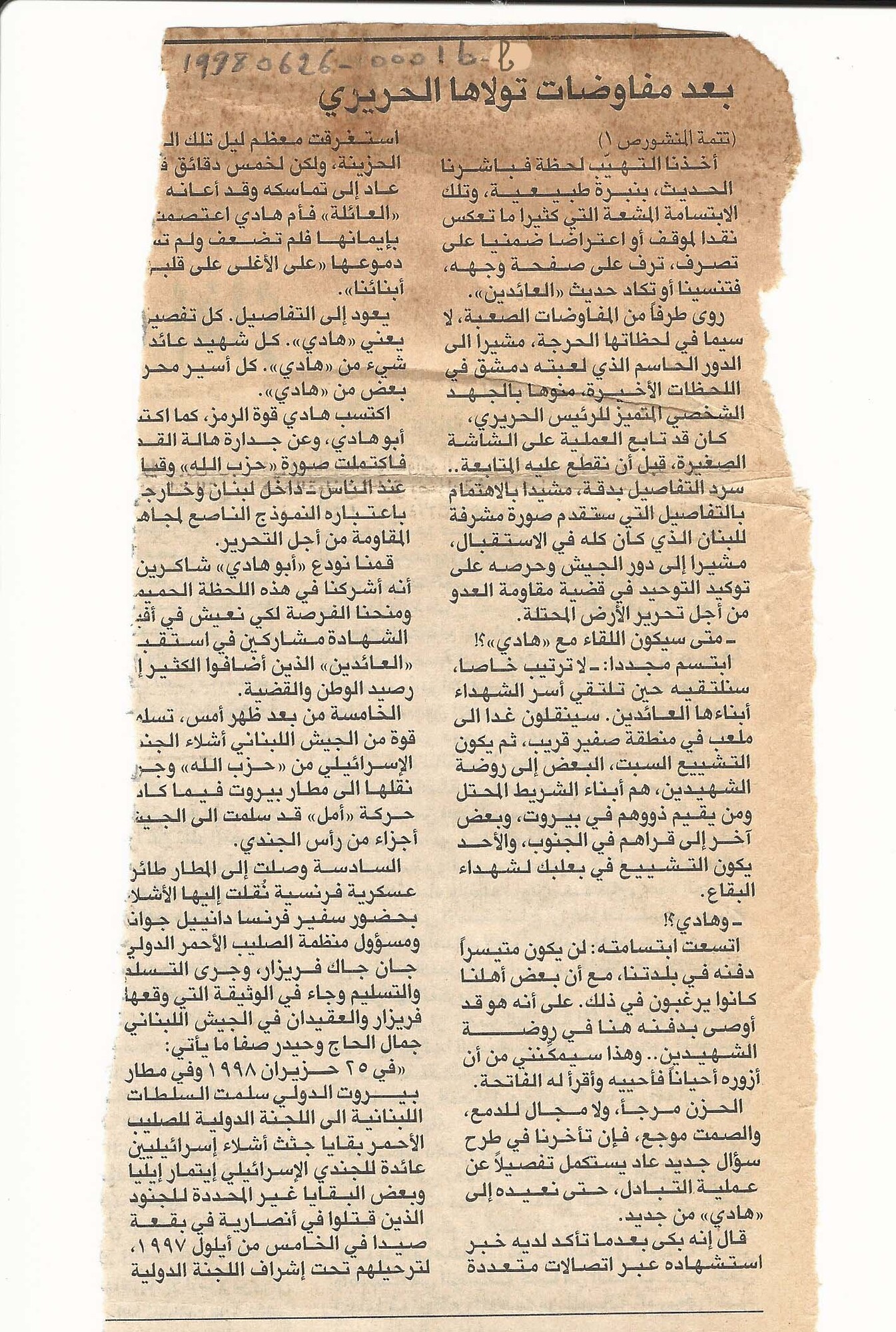 Following nine-month negotiations conducted by Hariri through France and ICRC, Lebanon will receive 40 of its martyrs tonight and 60 of its detainees today. Hassan Nasrallah: Hadi will be buried in the cemetery of Rawdat al-Shaheedayn so that I can visit him often for a salute.