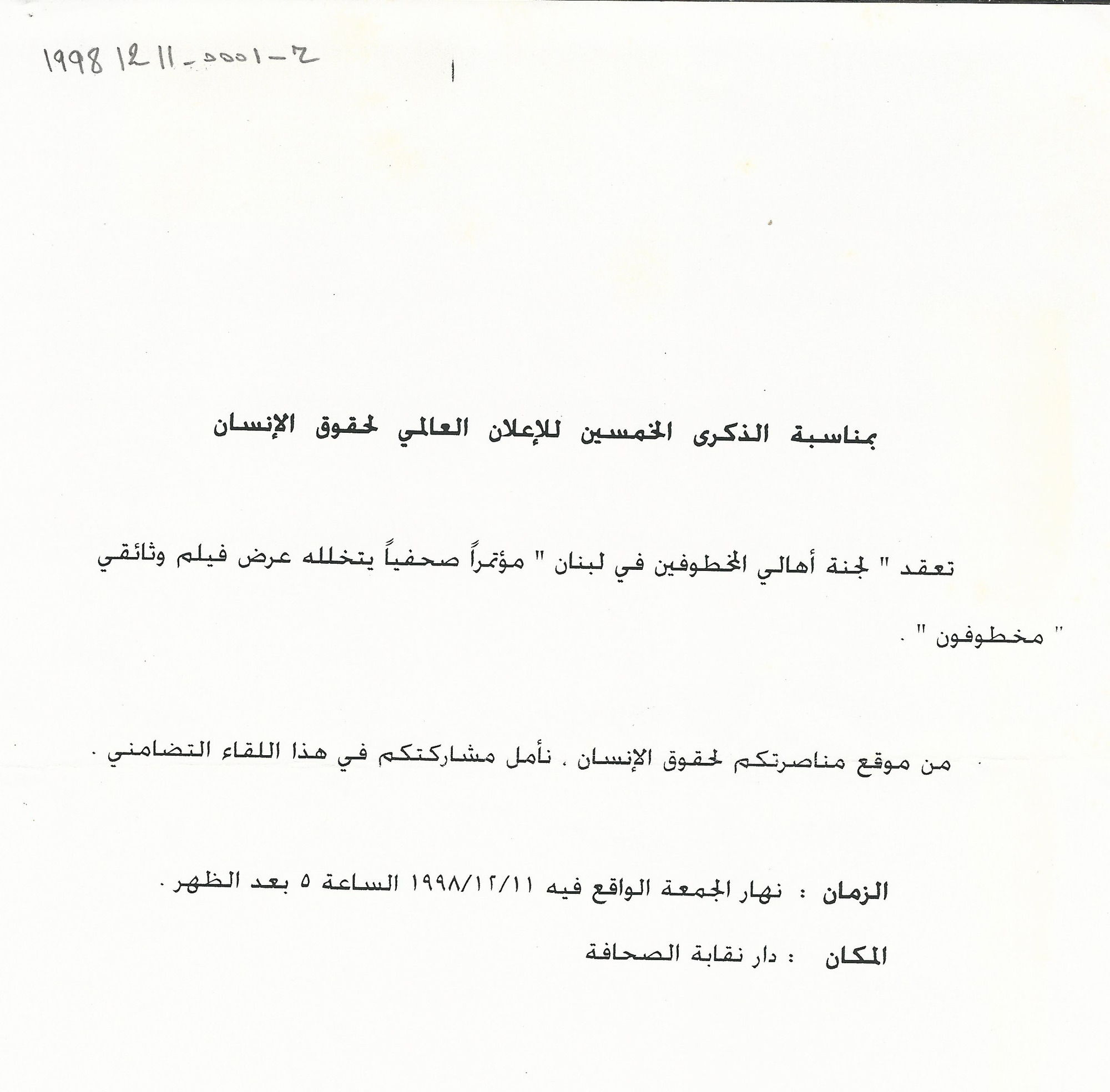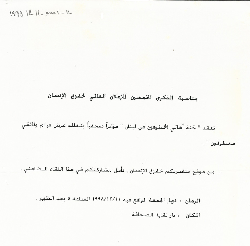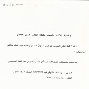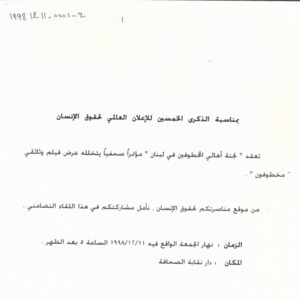 دعوة لجنة الاهالي الى مؤتمر صحفي بمناسبة الذكرى الخمسين للاعلان العالمي لحقوق الانسان