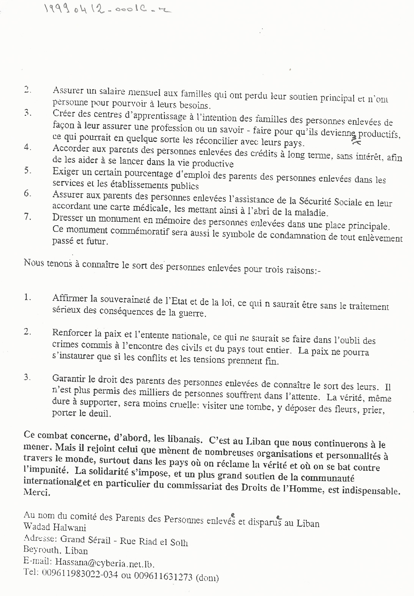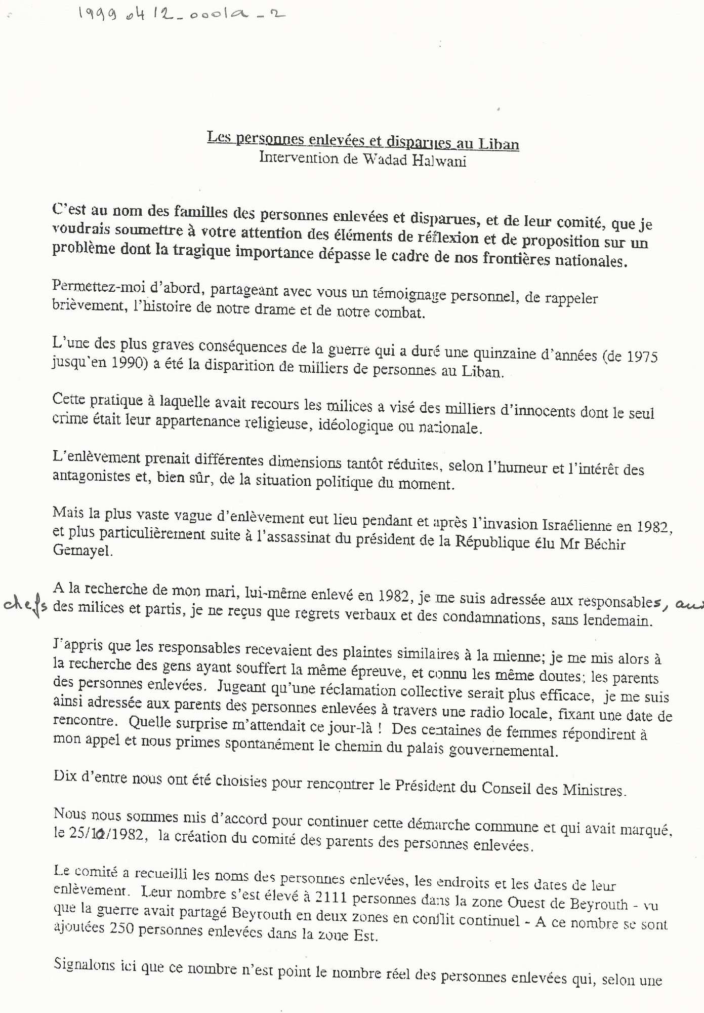 - fr Les personnes enlevees et disparues au Liban: Intervention de Wadad Halwani
