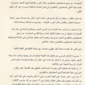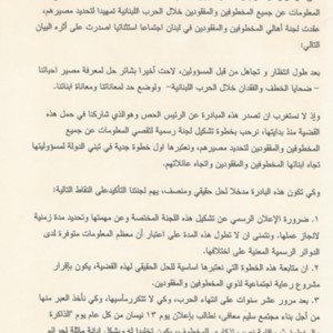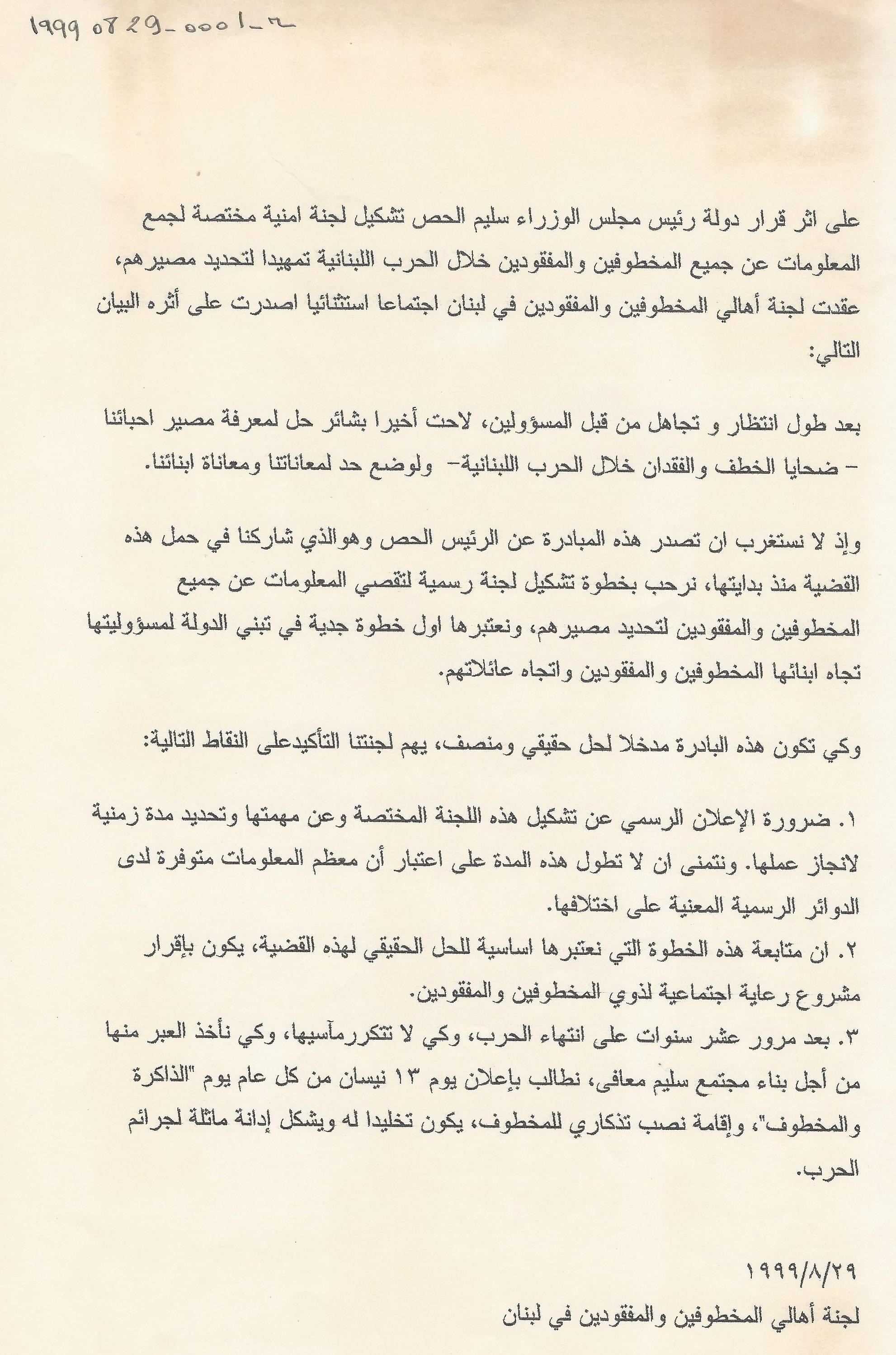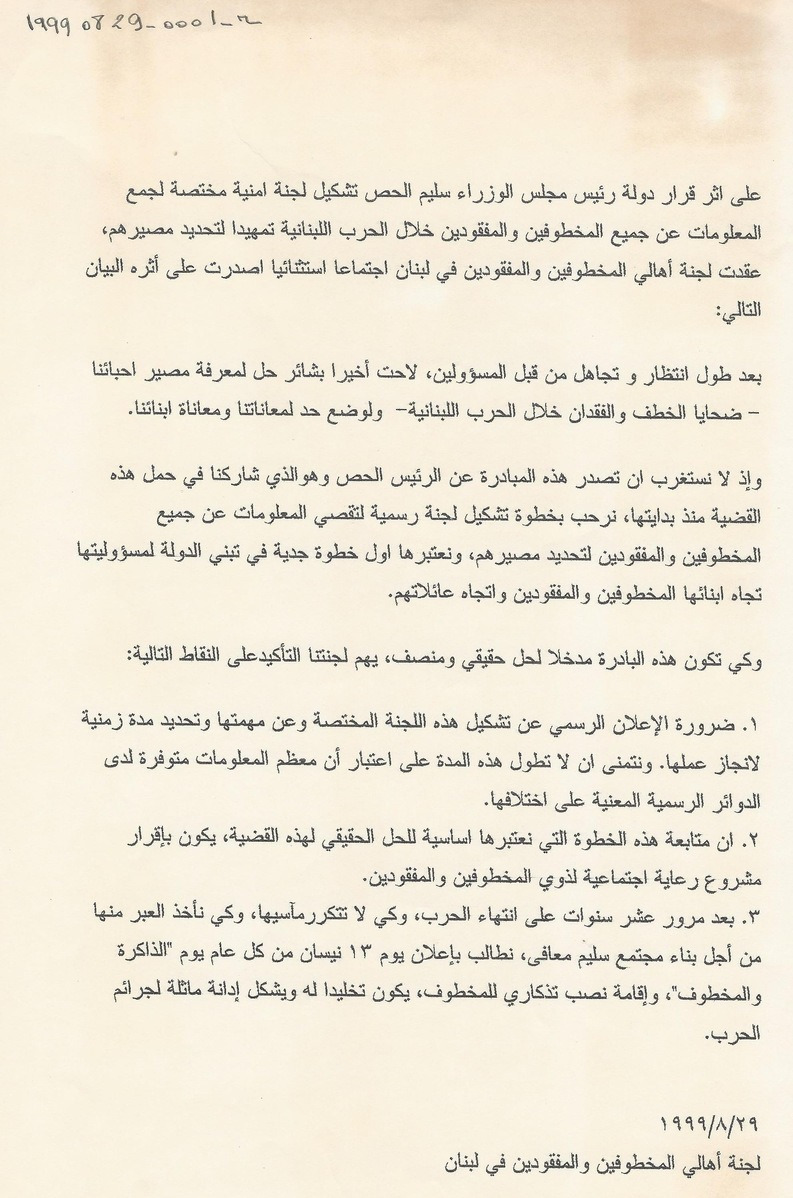- ar بيان لجنة الاهالي اثر تشكيل لجنة امنية مختصة لجمع معلومات عن المفقودين