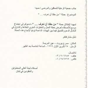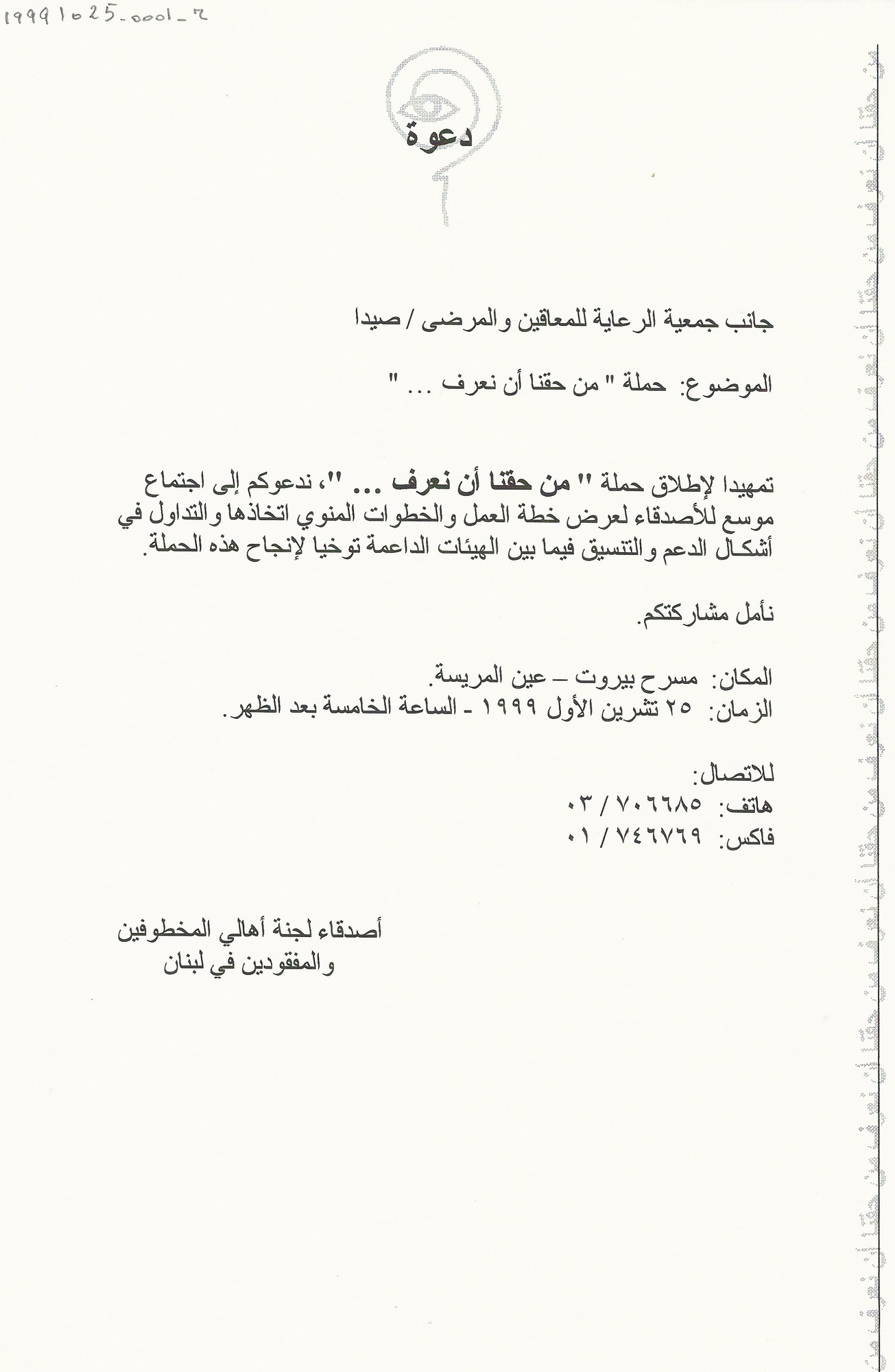 - ar دعوة جمعية الرعاية للمعاقين والمرضى في صيدا للمشاركة بحملة من حقنا ان نعرف