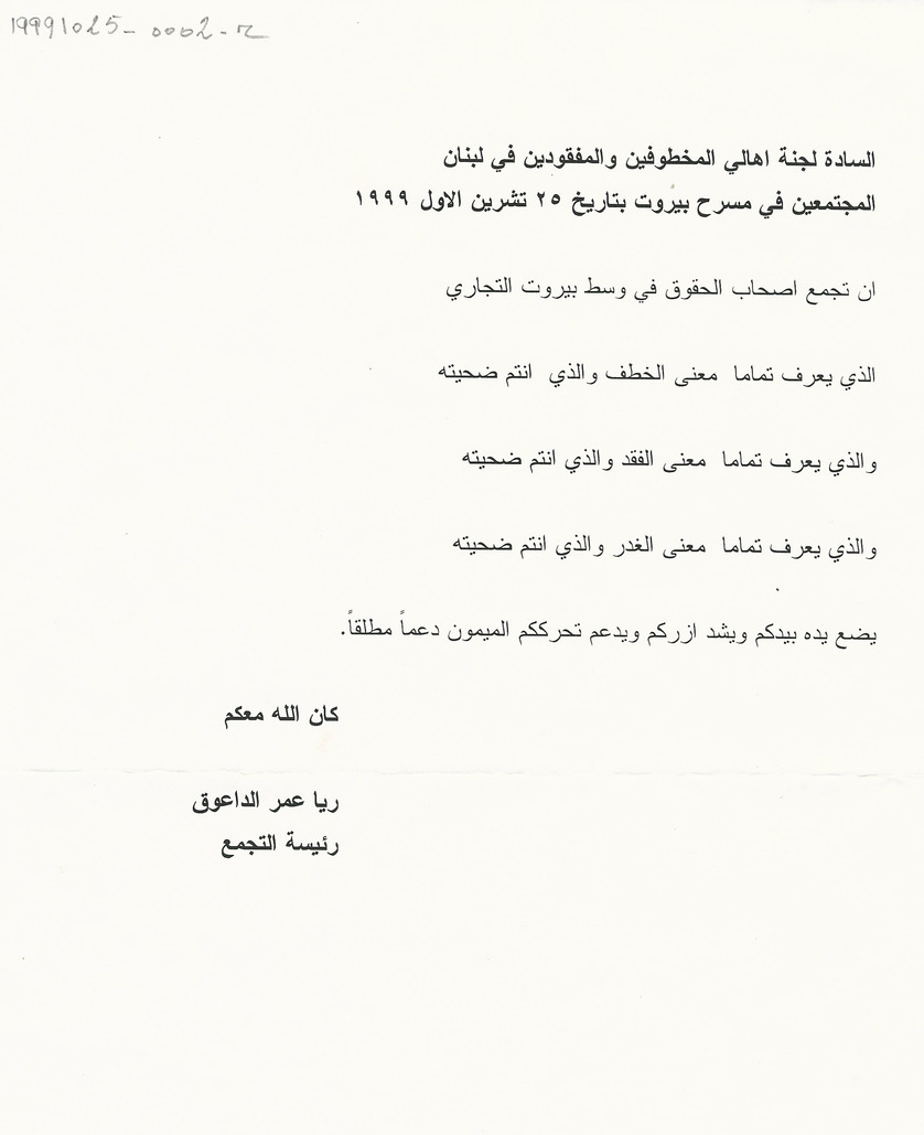 - en Dear members of the Committee of the Families of the Kidnapped and Missing in Lebanon, gathered in Beirut’s Grand Theater on October 25, 1999.