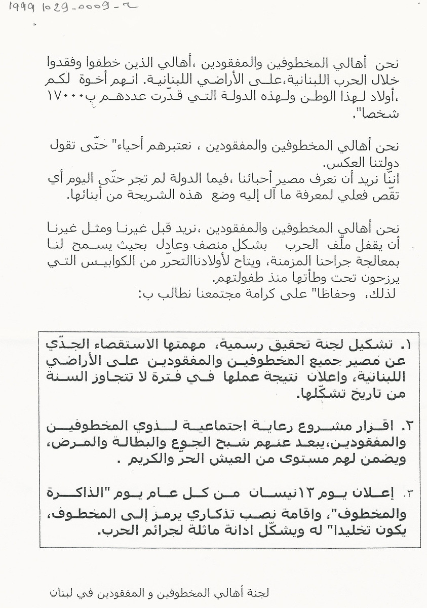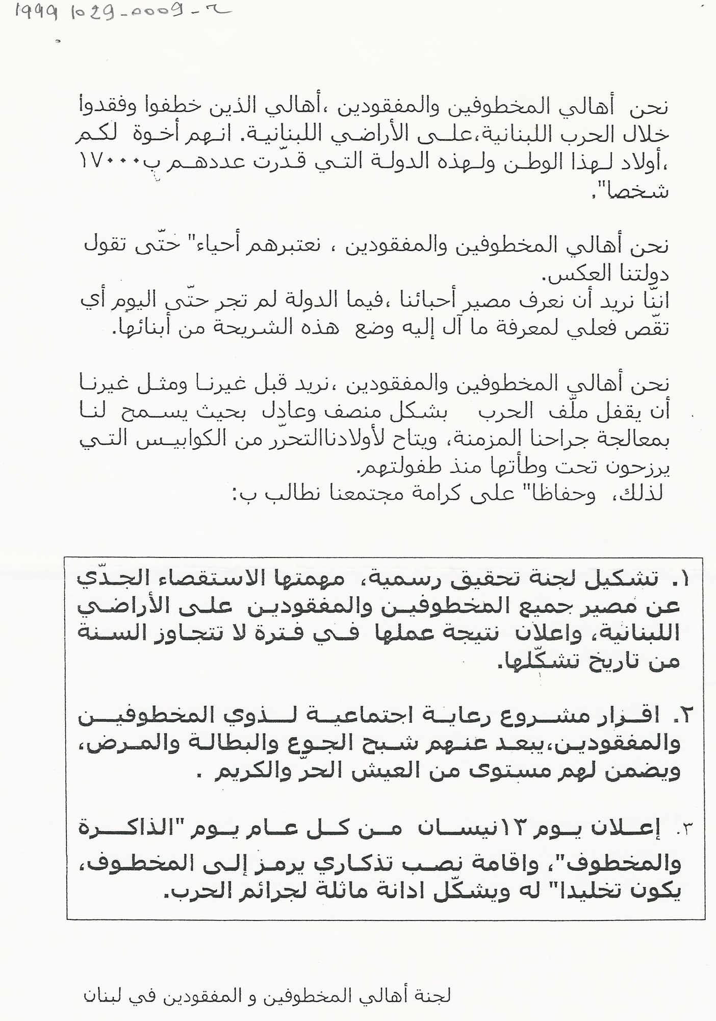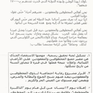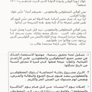 - ar مطالب اهالي المخطوفين المفقودين في لبنان