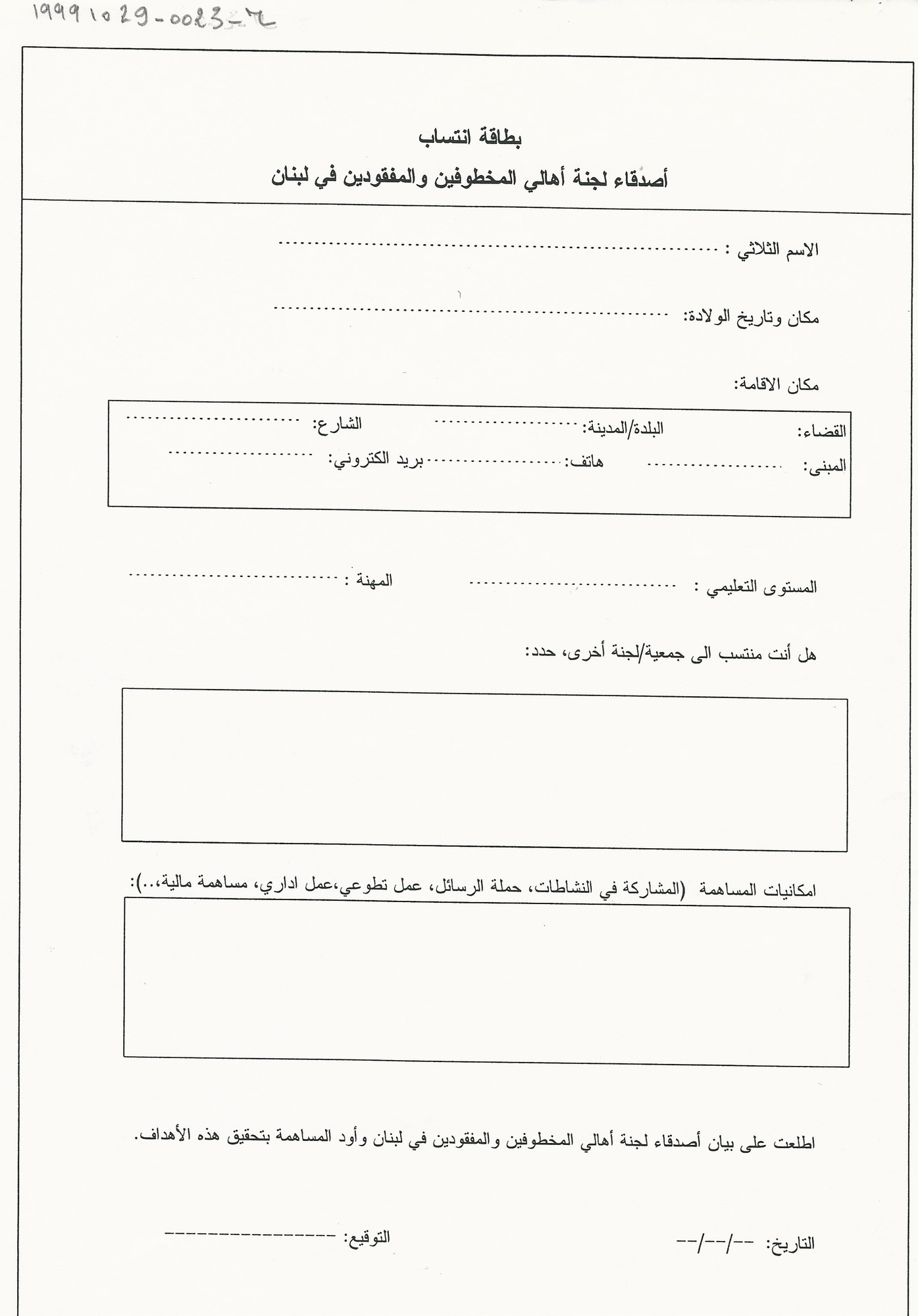 - ar بطاقة انتساب أصدقاء لجنة أهالي المخطوفين والمفقودين في لبنان