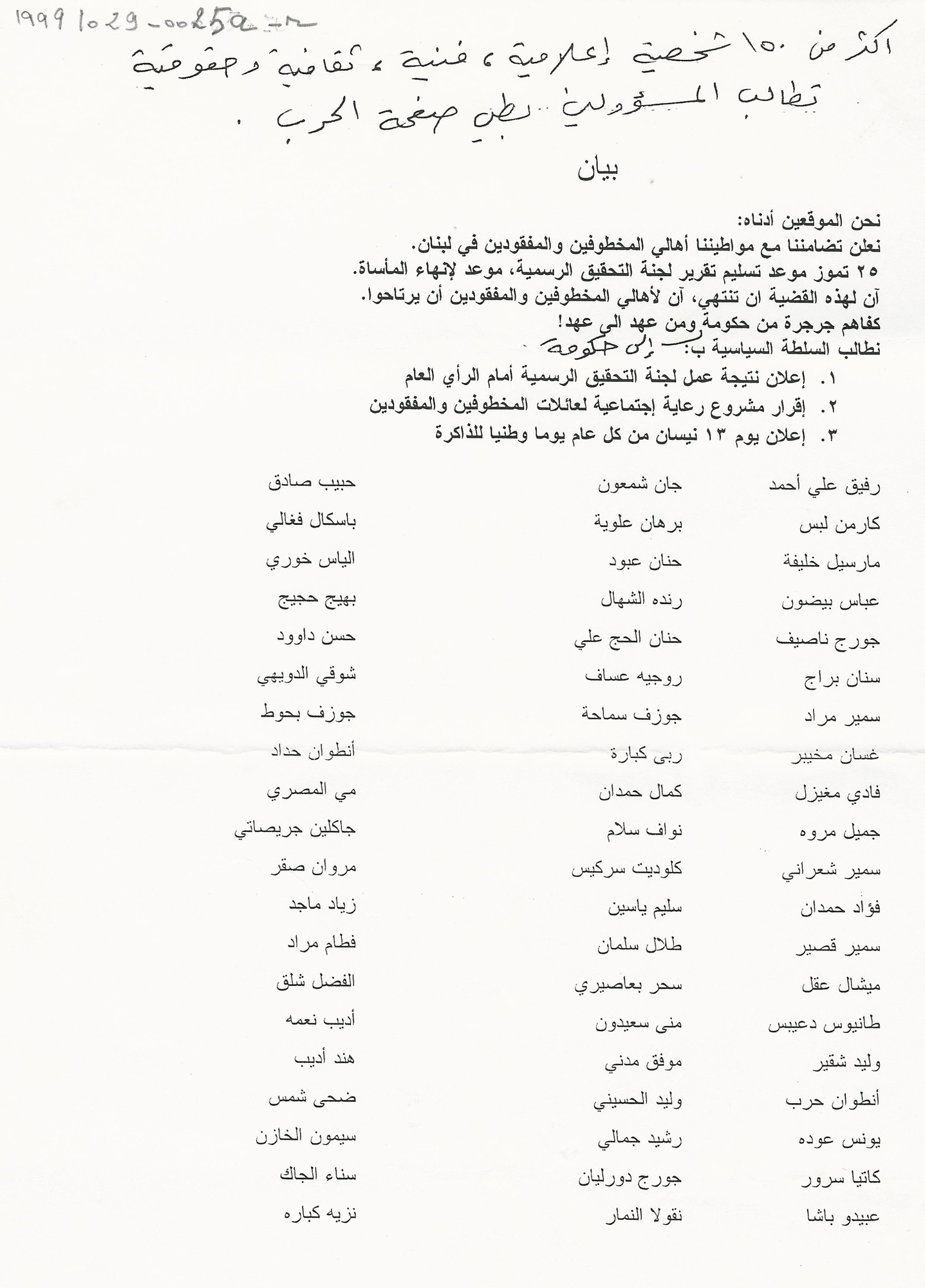 - ar اكثر من 150 شخصية اعلامية، فنية، ثقافية وحقوقية تطالب المسؤلين بطي صفحة الحرب