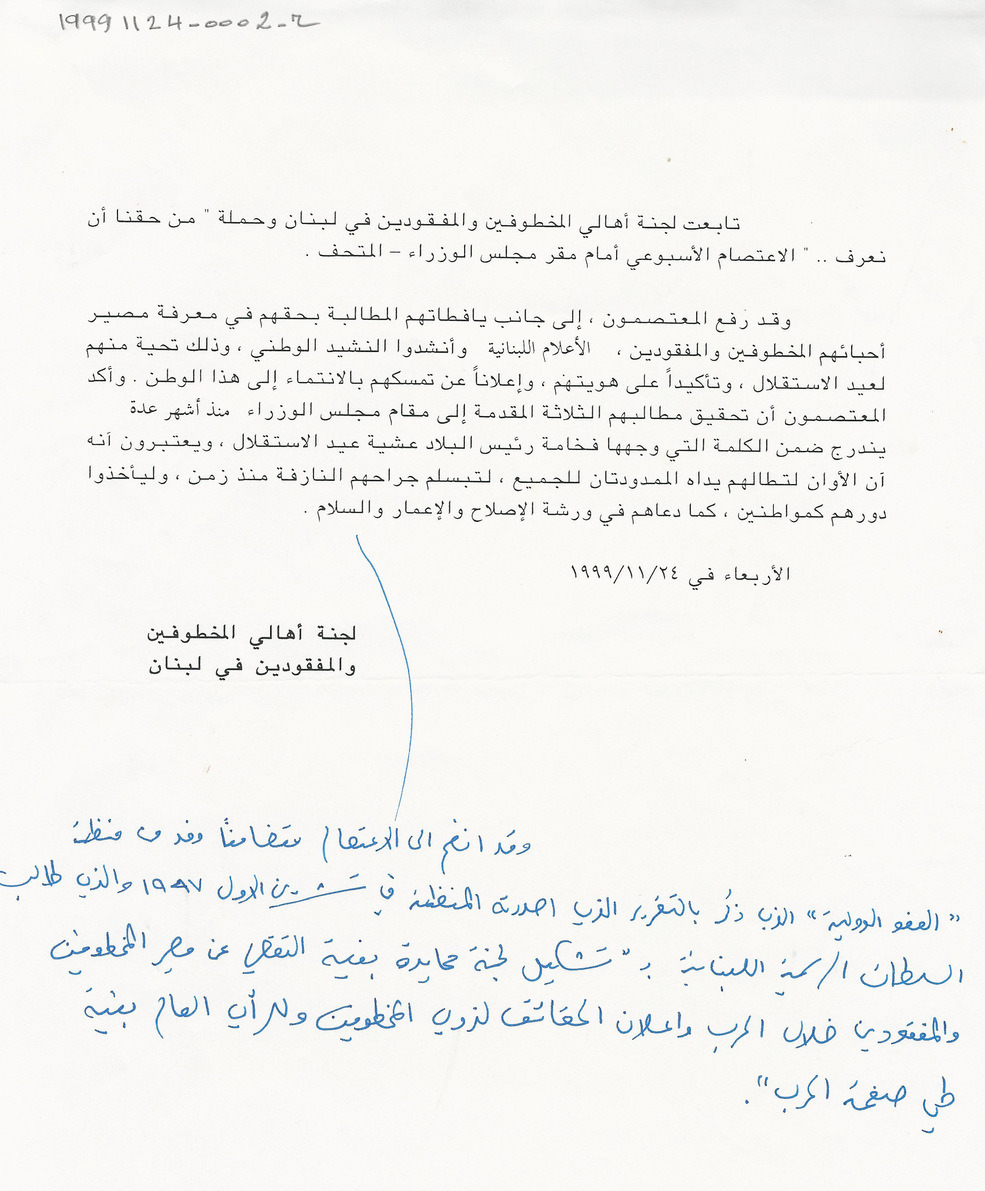 The Committee of the Families of the Kidnapped and Missing in Lebanon and the “Our Right to Know” campaign continued their weekly sit-in in front of the government palace.