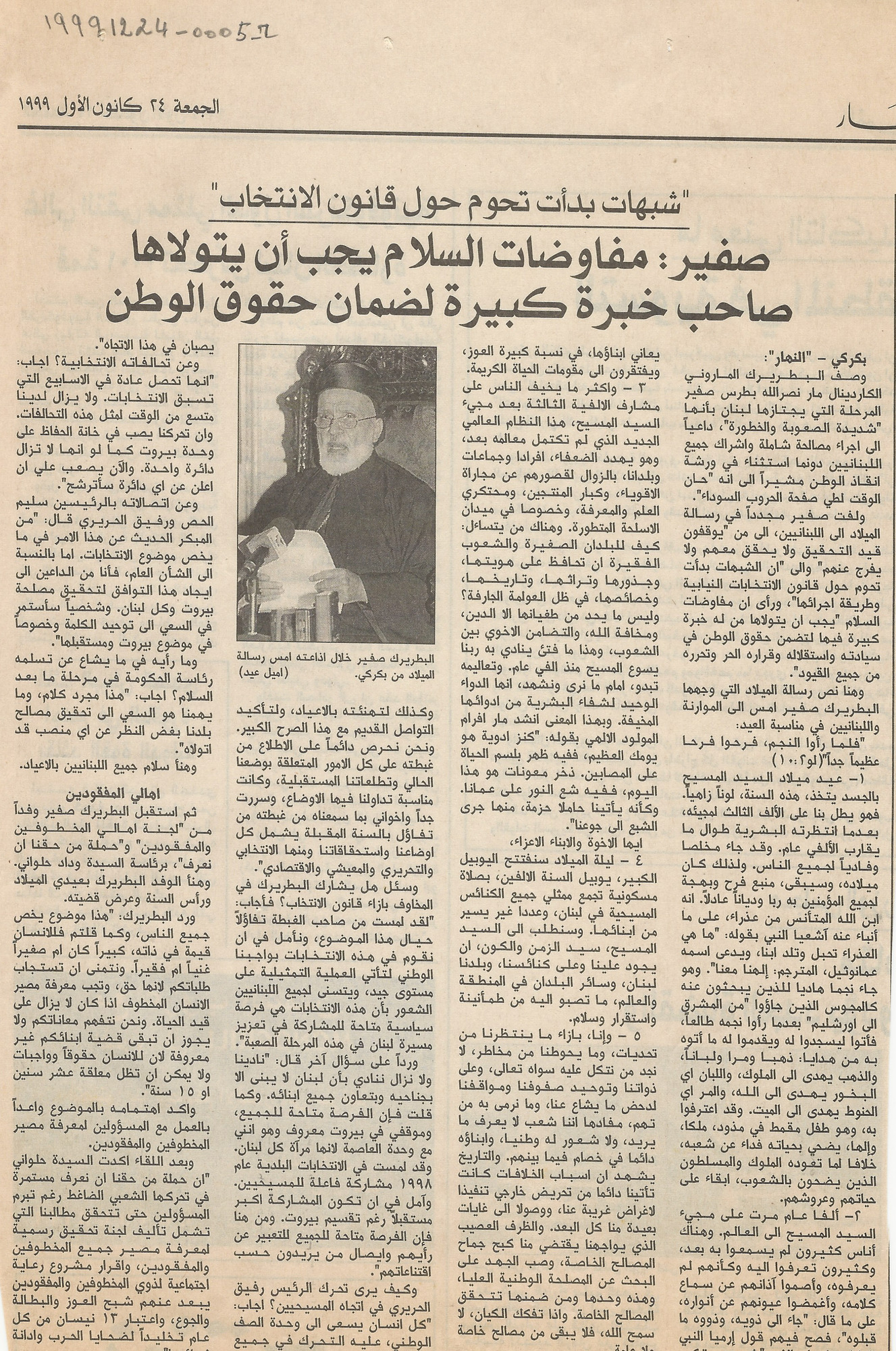 Sfeir: Peace negotiations should be conducted by highly-experienced experts in order to protect the rights of the nation. Suspicions started to hover over election law.