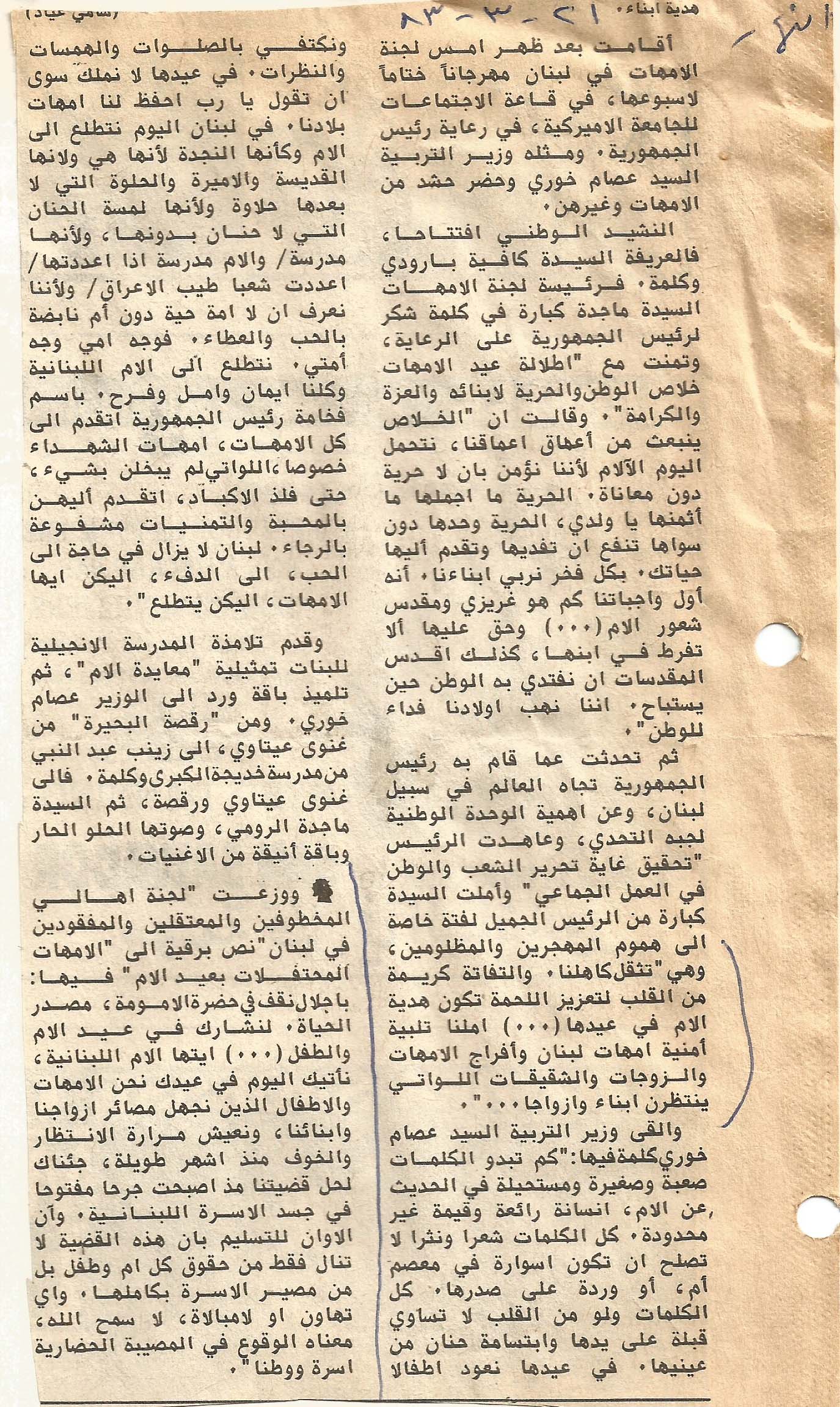 - en The Committee of Mothers in Lebanon held a festival yesterday to end its event week.