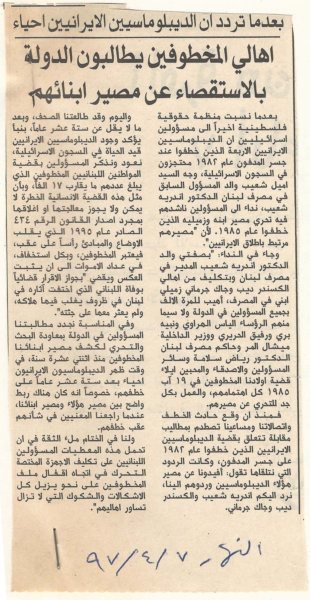بعد أن تردد أن الدبلوماسيين الايرانيين أحياء: اهالي المخطوفين يطالبون الدولة بالاستقصاء عن مصير ابنائهم