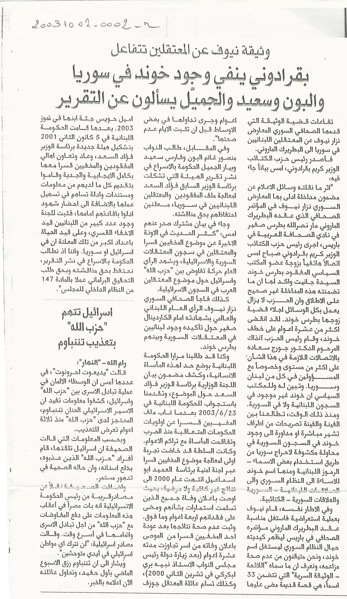 وثيقة نيوف عن المعتقلين تتفاعل: بقرادوني ينفي وجود خوند في سوريا والبون وسعيد والجميل يسألون عن التقرير