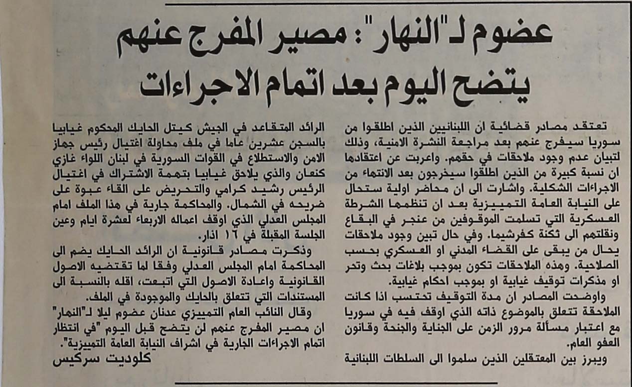 - en Addoum to an-Nahar: The fate of the released detainees will be clarified today after the execution of procedures.