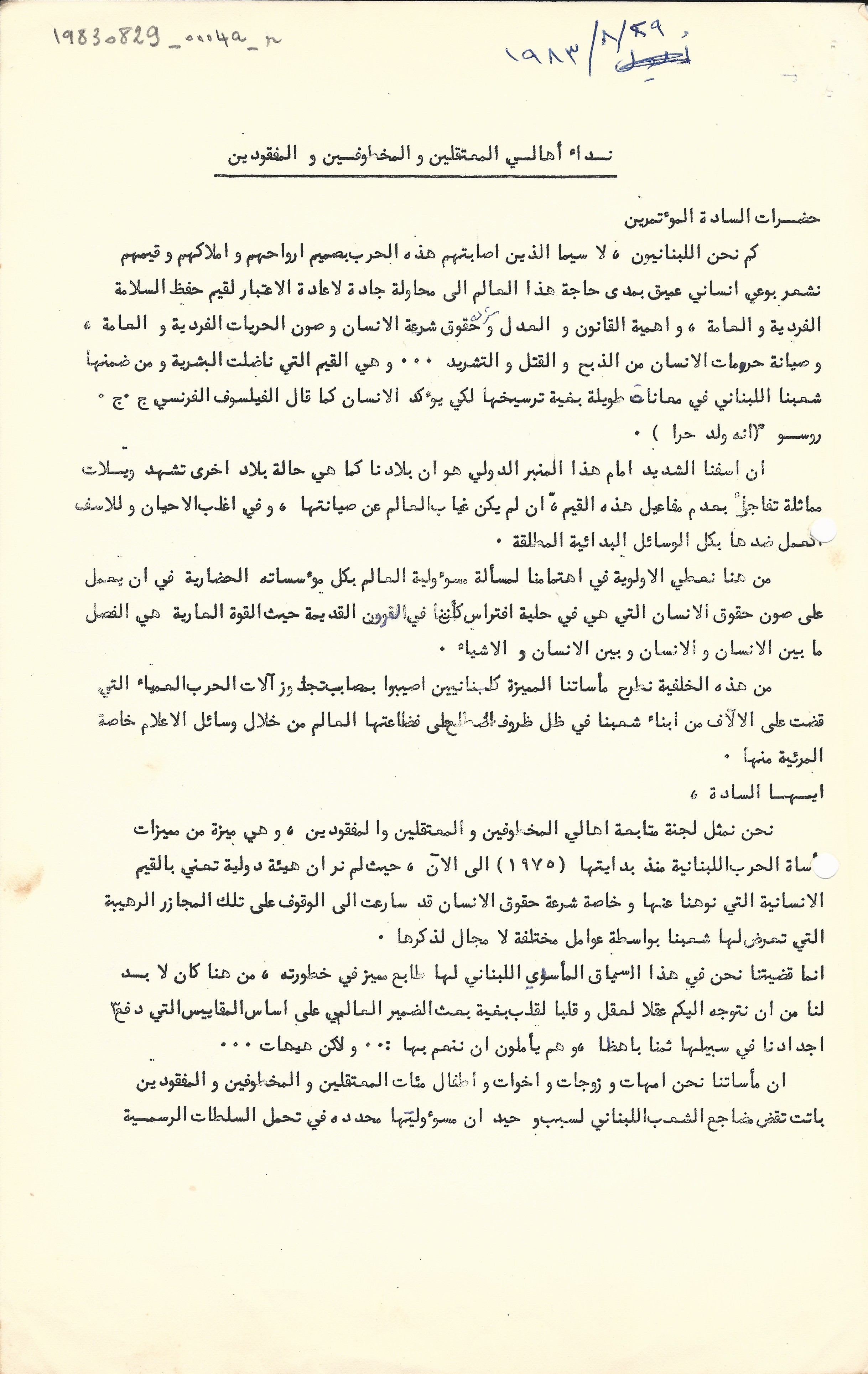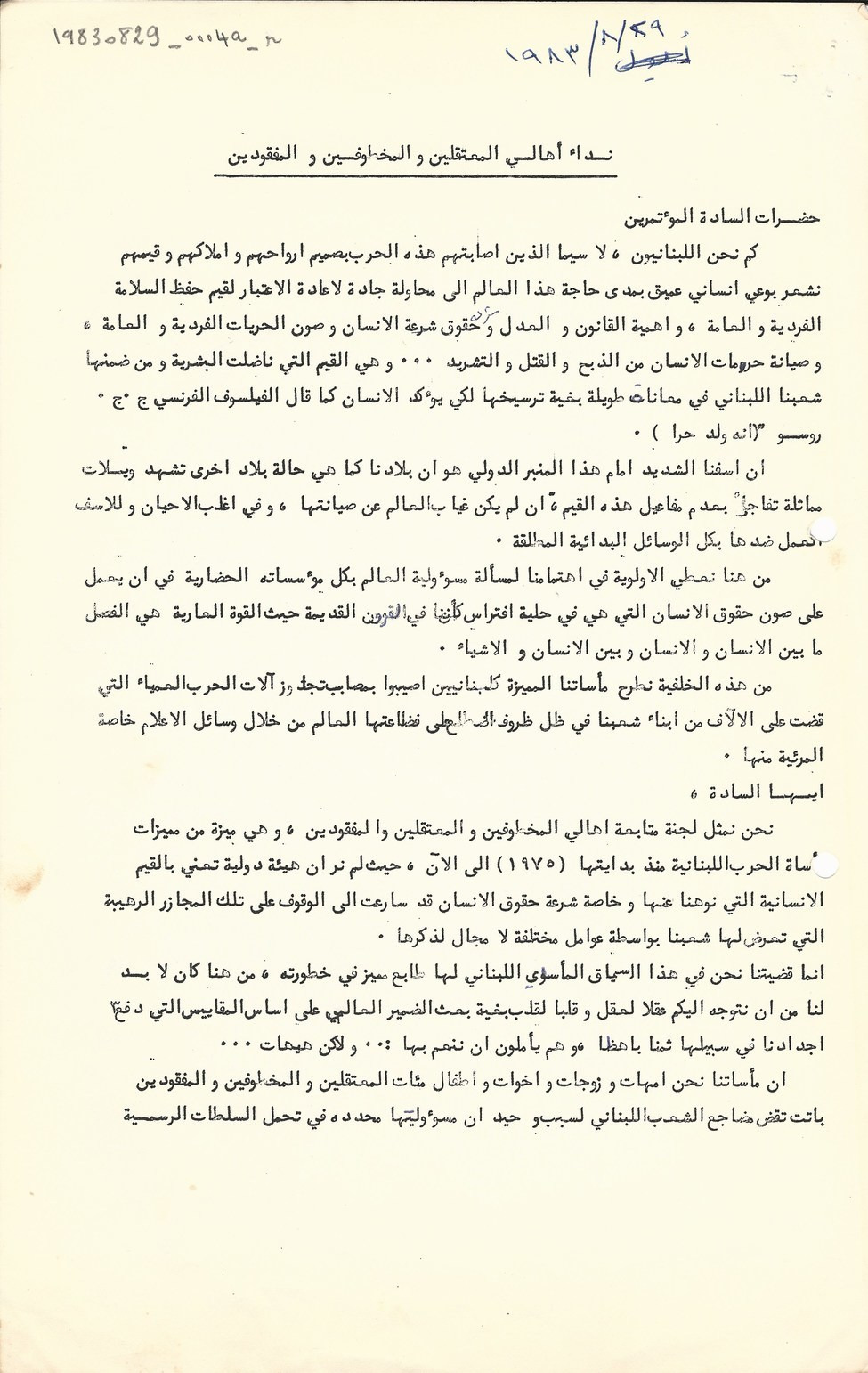- ar نداء اهالي المعتقلين والمخطوفين والمفقودين