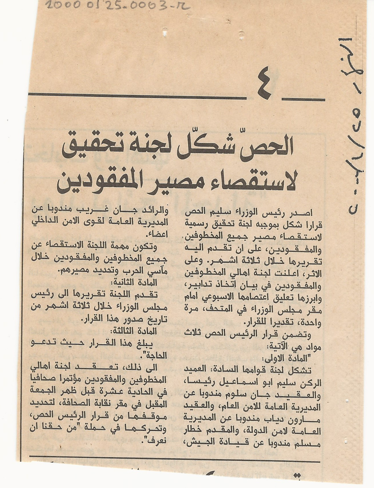 - en Al-Hoss forms a commission of inquiry into the fate of the missing.