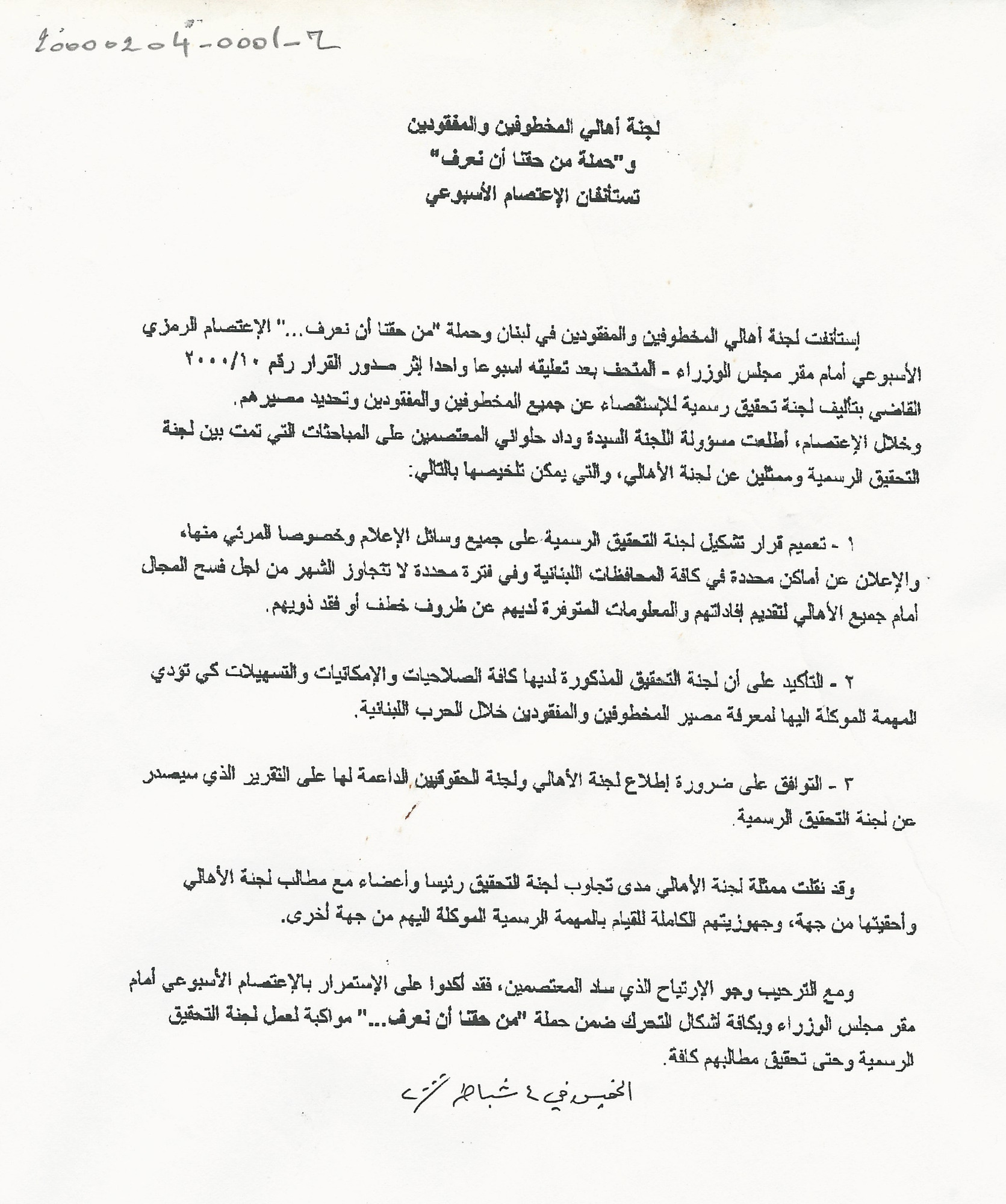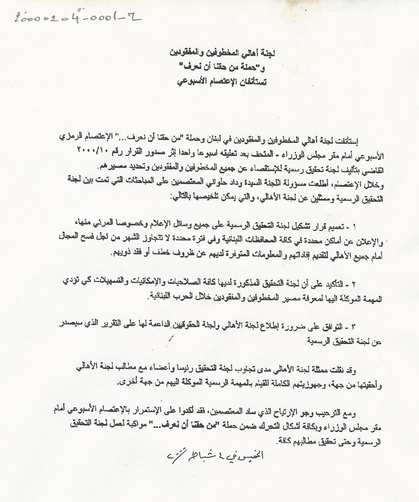 - ar لجنة أهالي المخطوفين والمفقودين وحملة من حقنا ان نعرف تستأنفان الاعتصام الاسبوعي