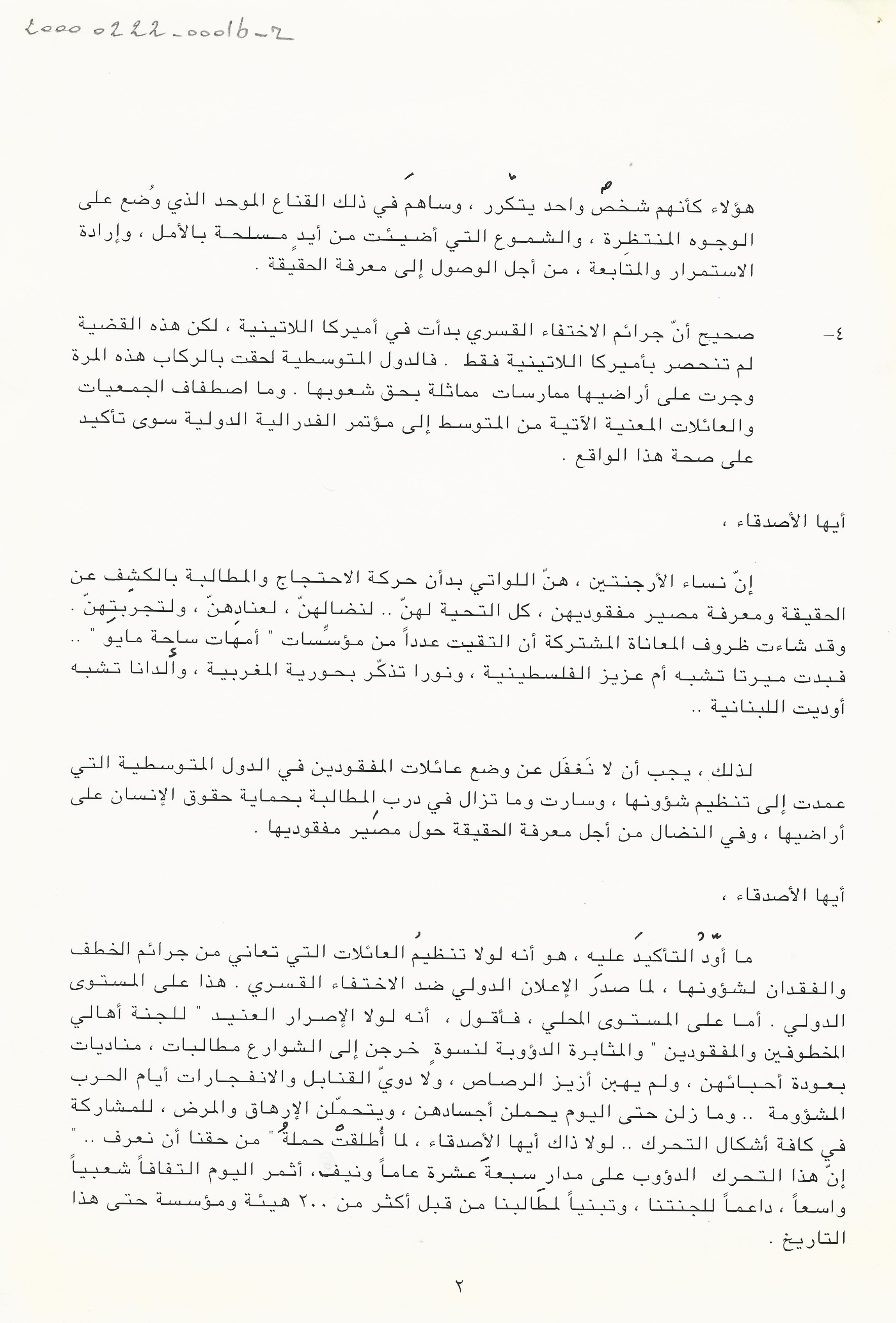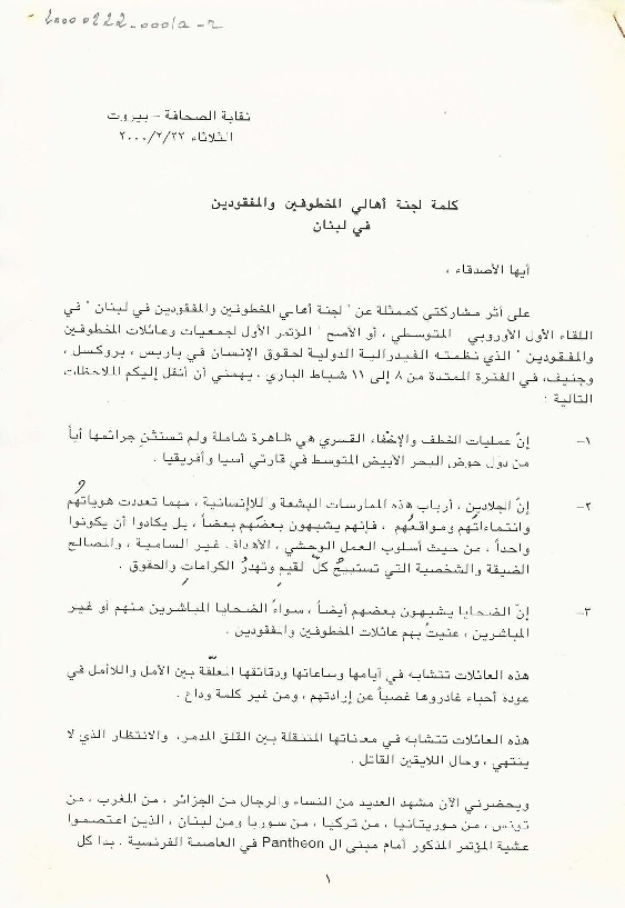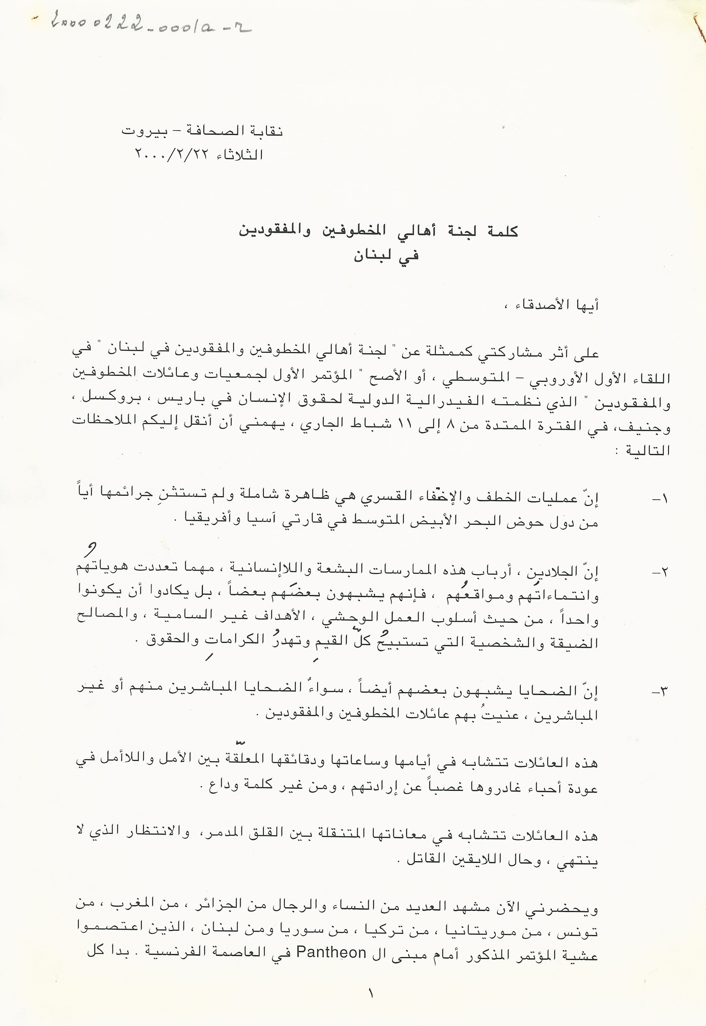 كلمة لجنة اهالي المخطوفين والمفقودين في لبنان خلال المؤتمر الصحافي إثر اللقاء الأورو-متوسطي الأول لذوي المخطوفين في باريس