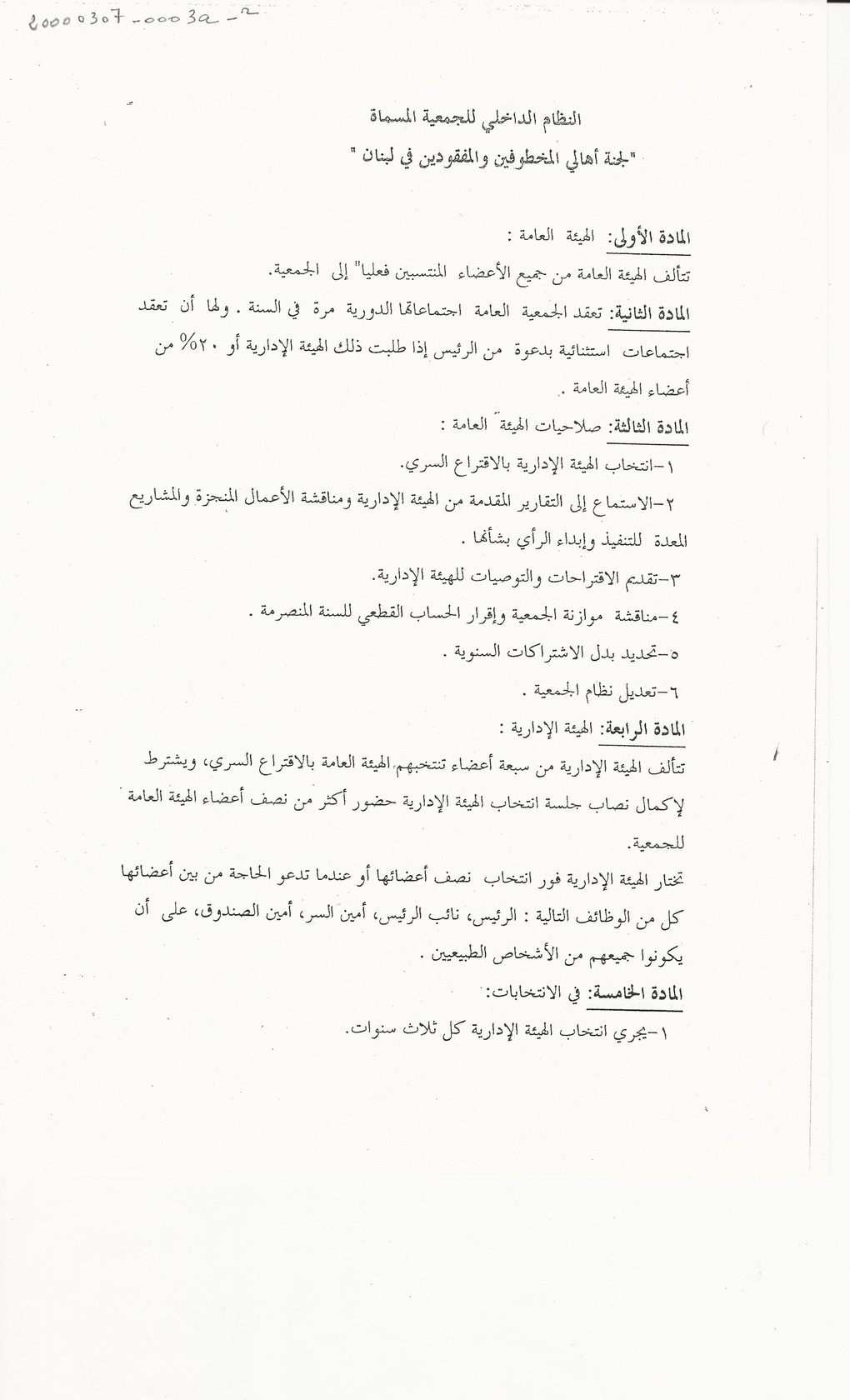 النظام الداخلي للجمعية المسماة لجنة اهالي المخطوفين والمفقودين في لبنان