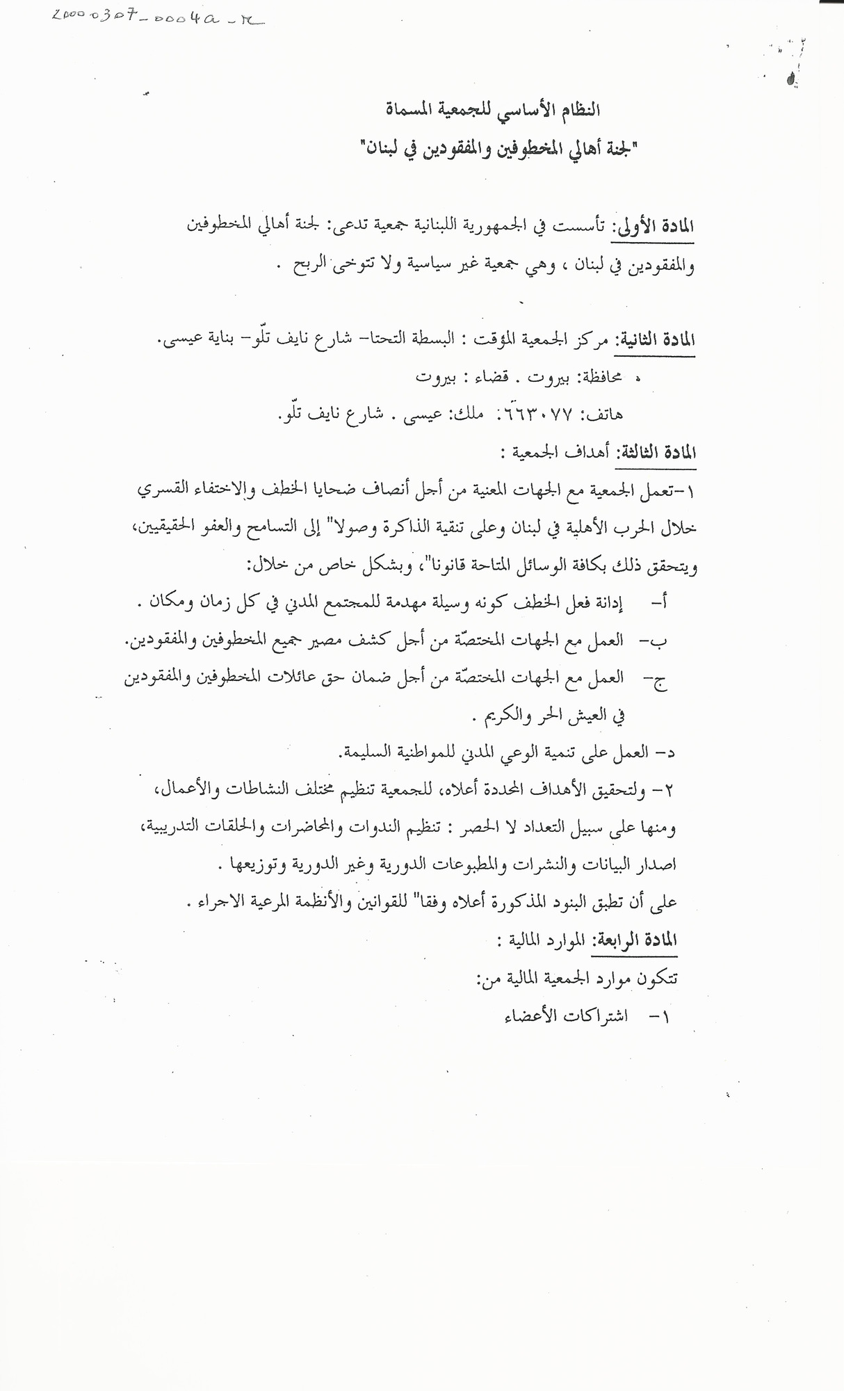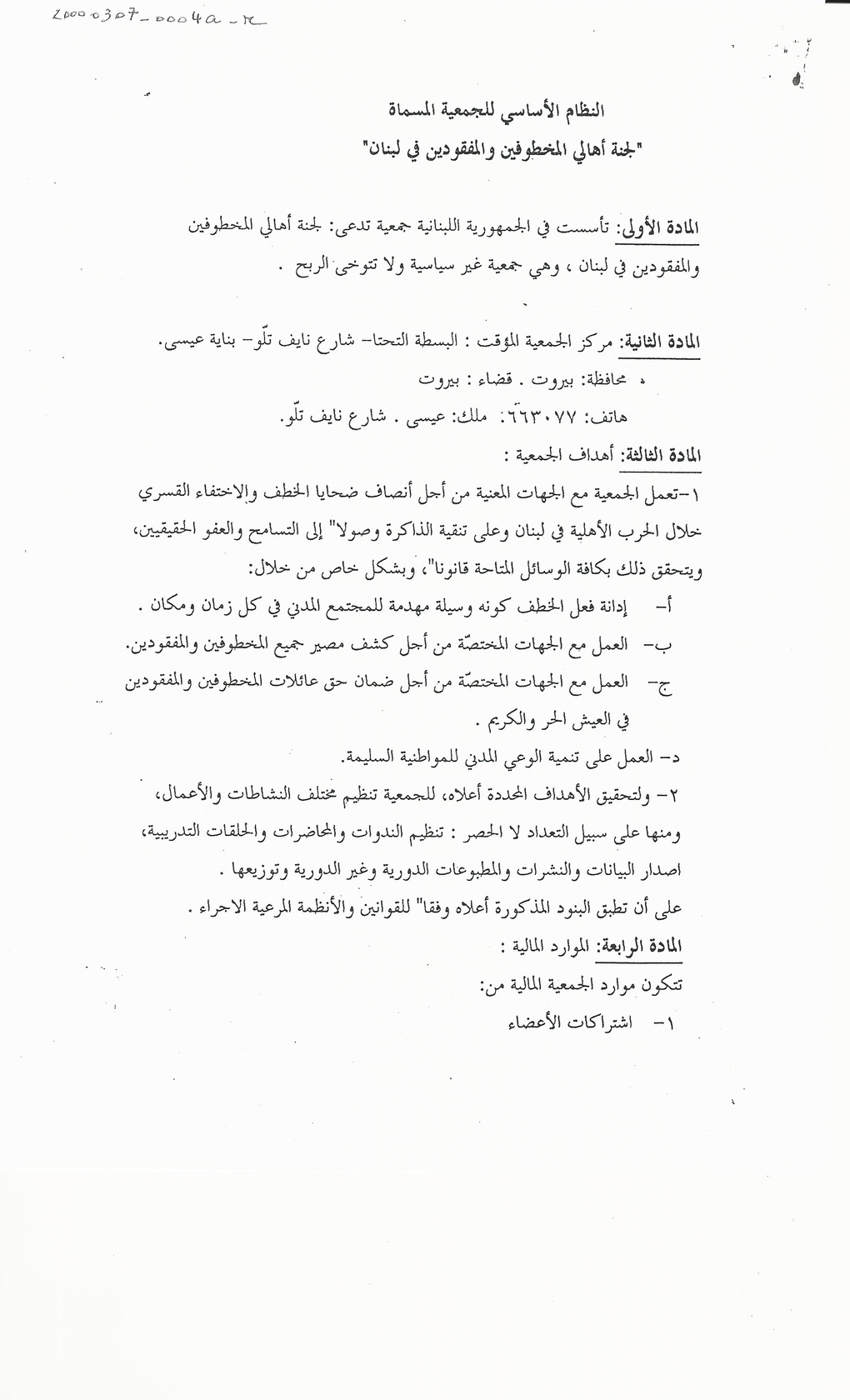 النظام الاساسي للجمعية المسماة لجنة اهالي المخطوفين والمفقودين في لبنان