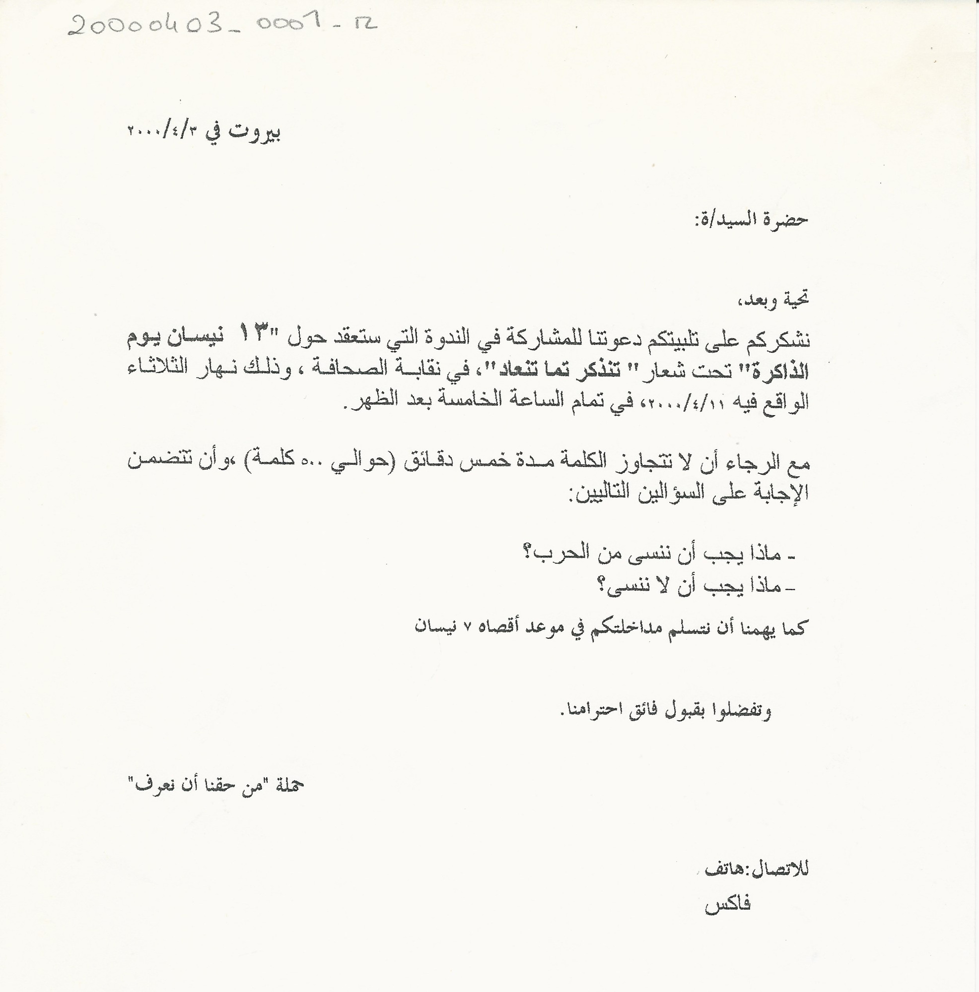 - ar دعوة للمشاركة في ندوة حول 13 نيسان يوم الذاكرة