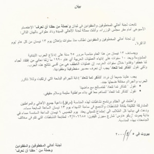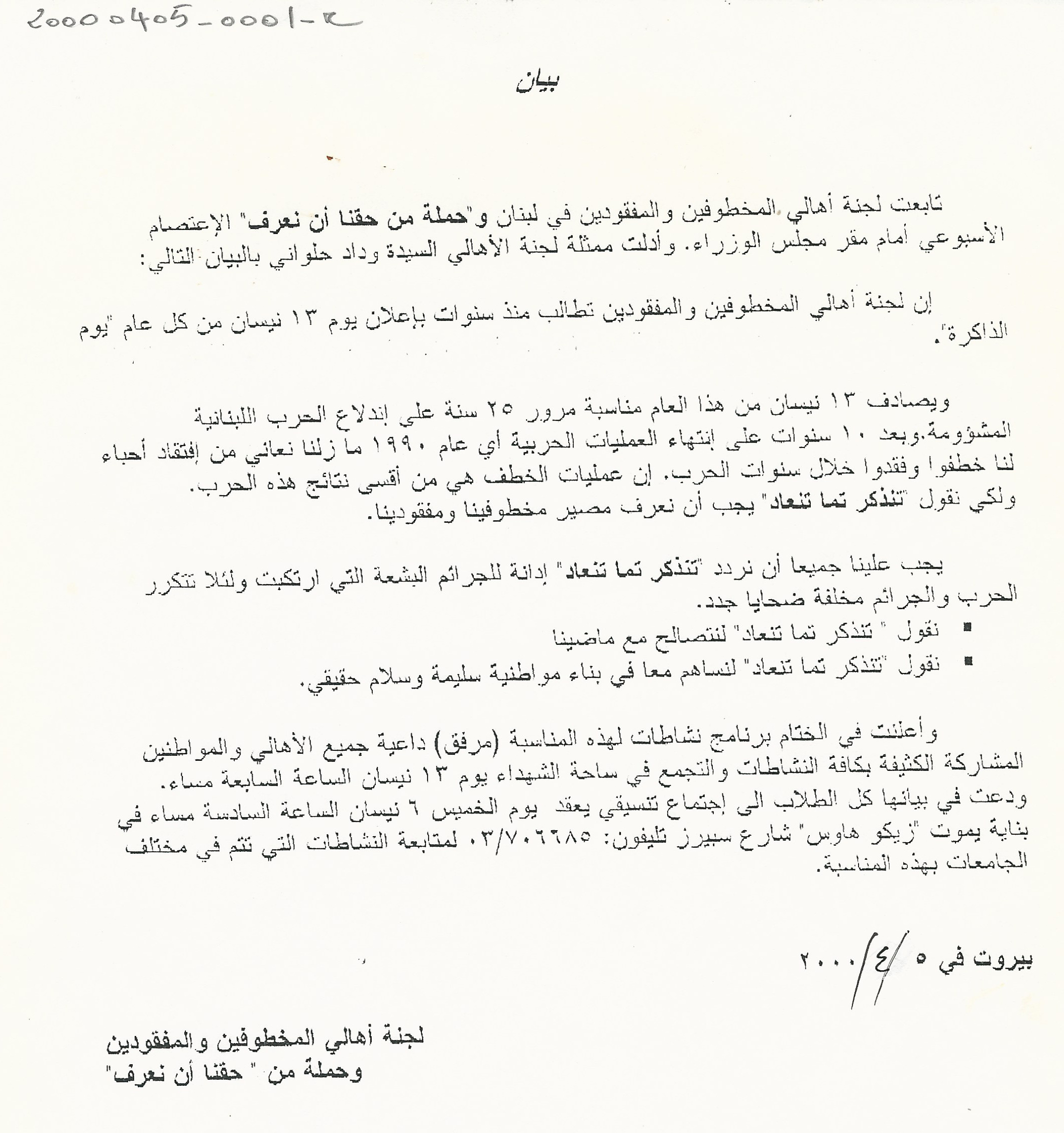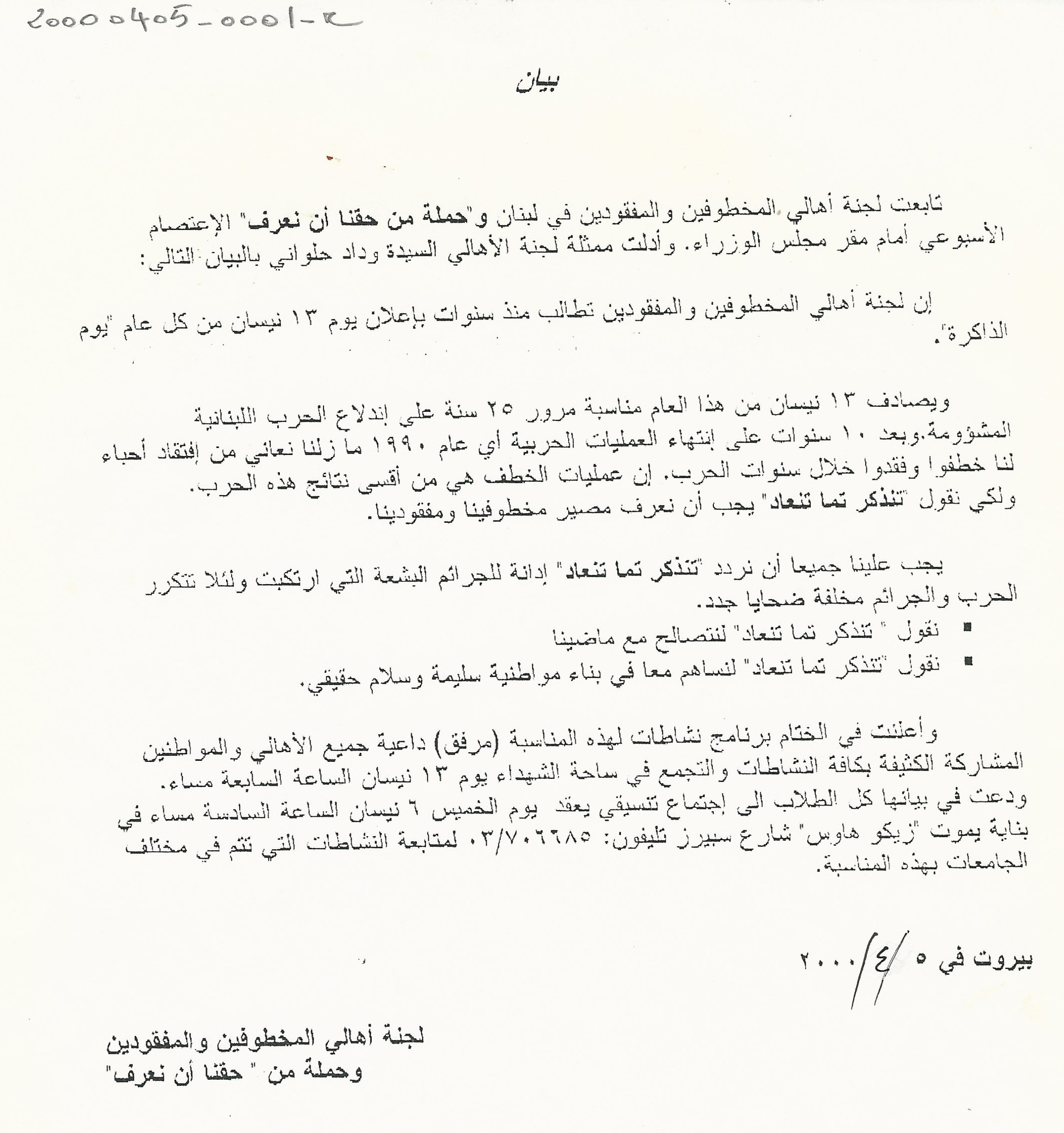 اعلان لجنة اهالي المخطوفين والمفقودين وحملة من حقنا ان نعرف برنامج نشاطات 13 نيسان