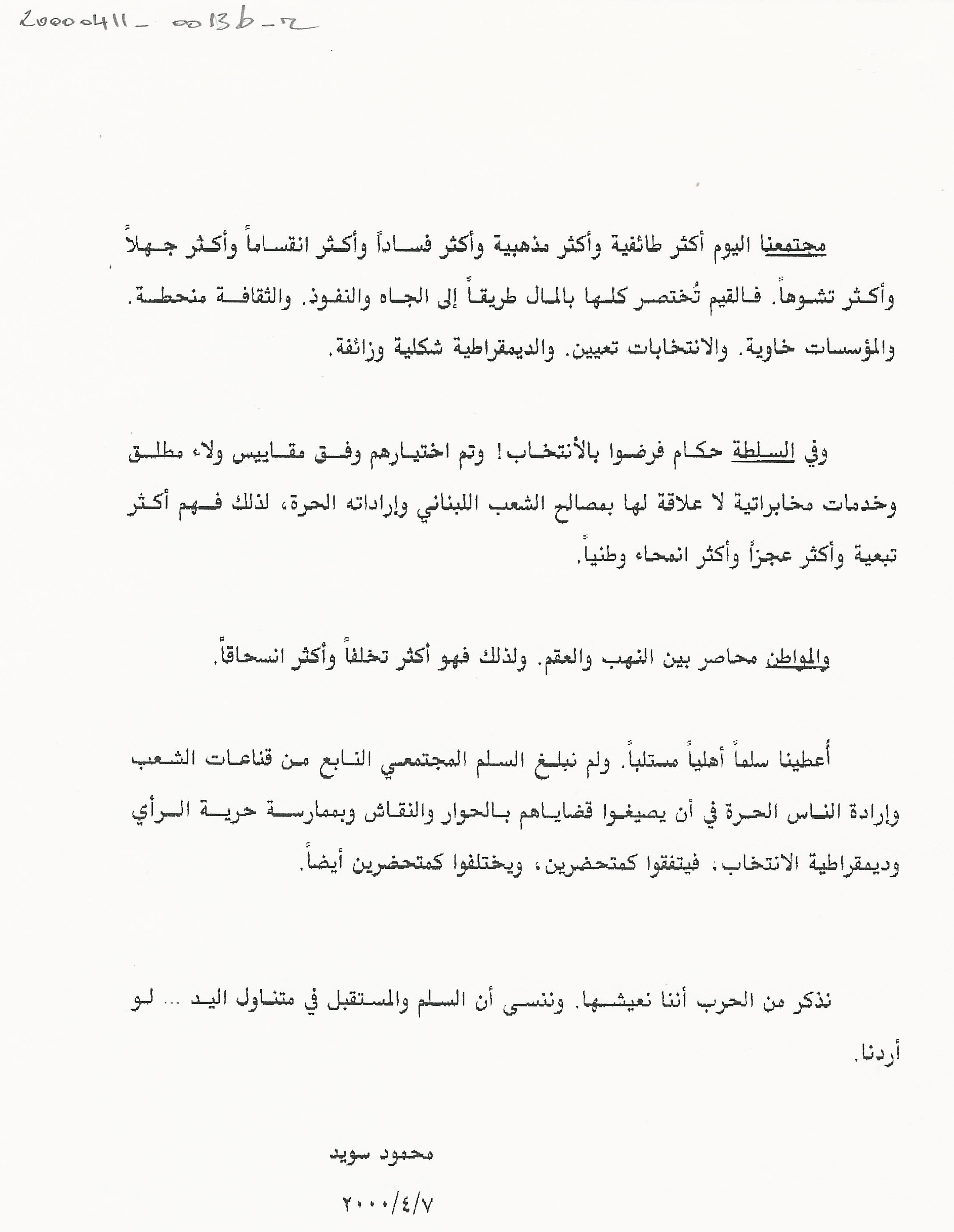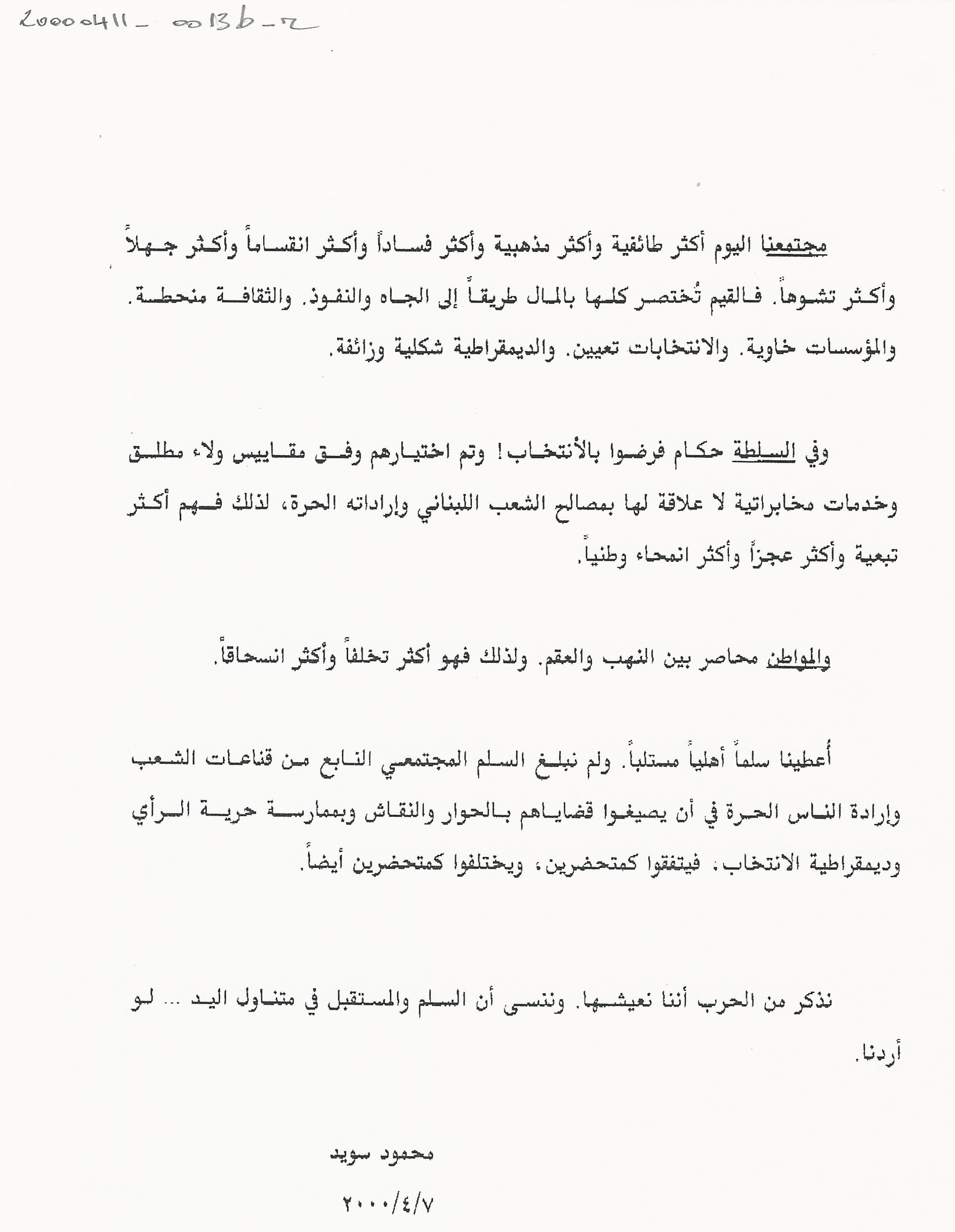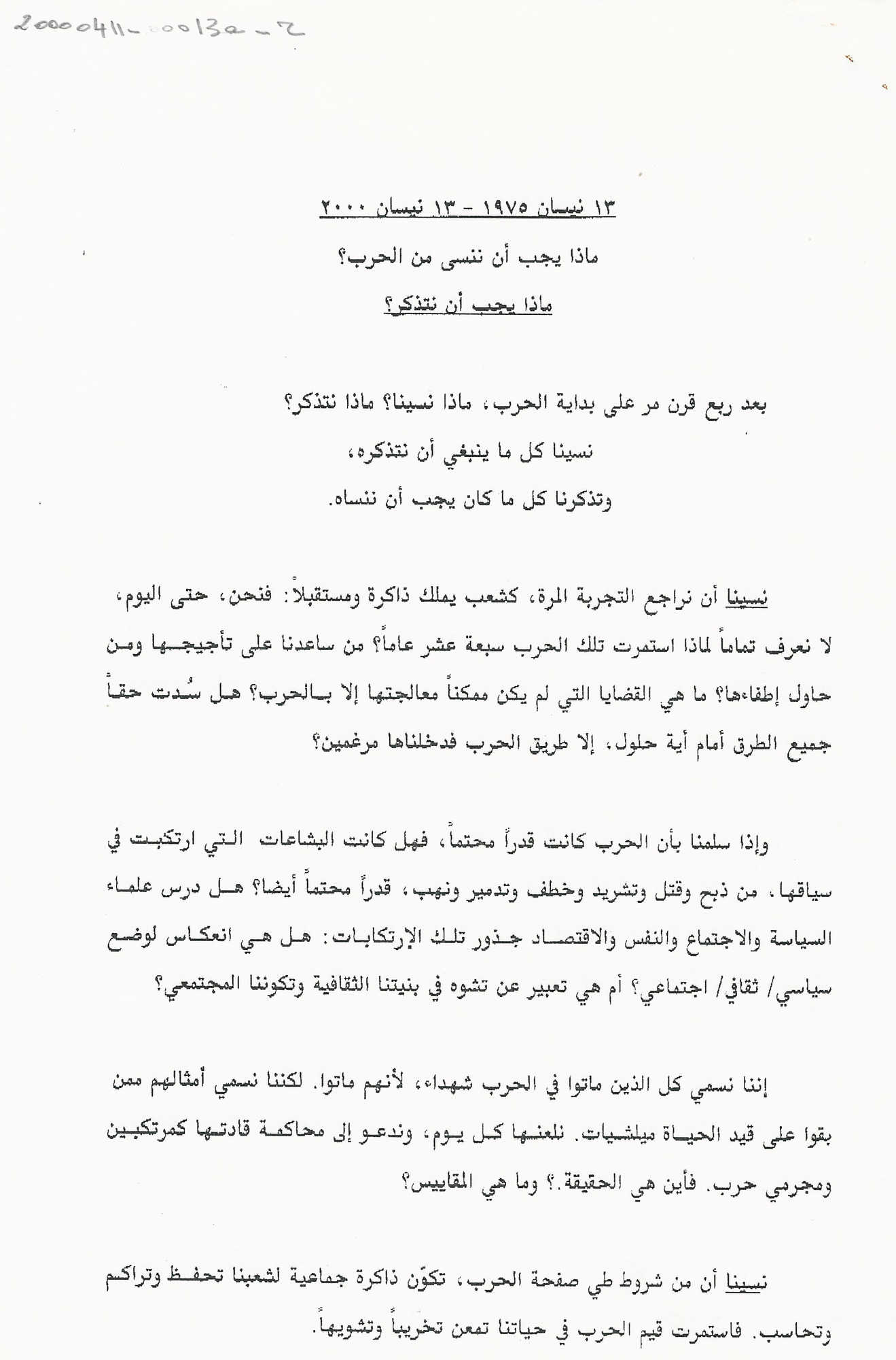 - ar كلمة محمود سويد بندوة 13 نيسان : ماذا يجب ان ننسى، ماذا يجب ان نتذكر من الحرب