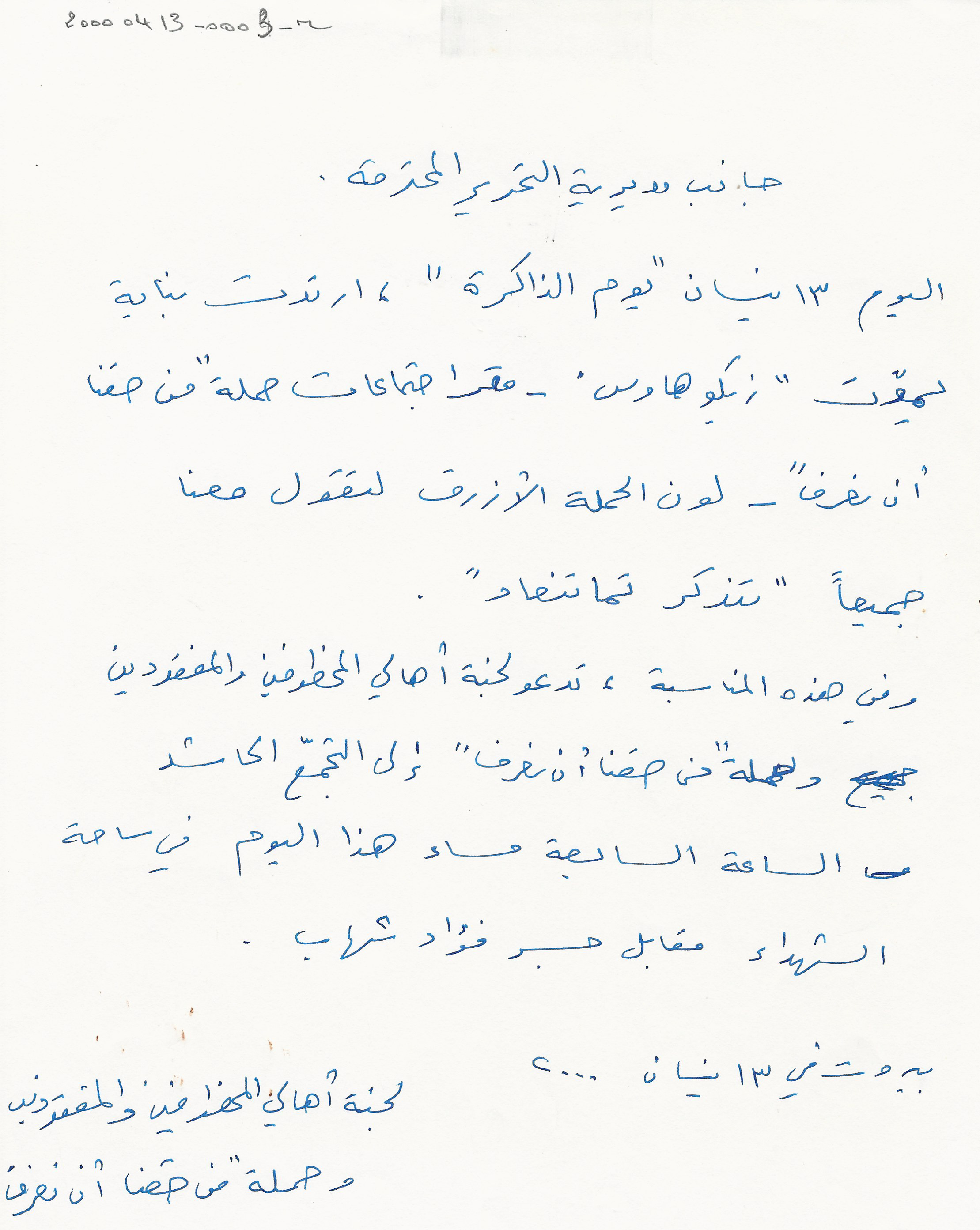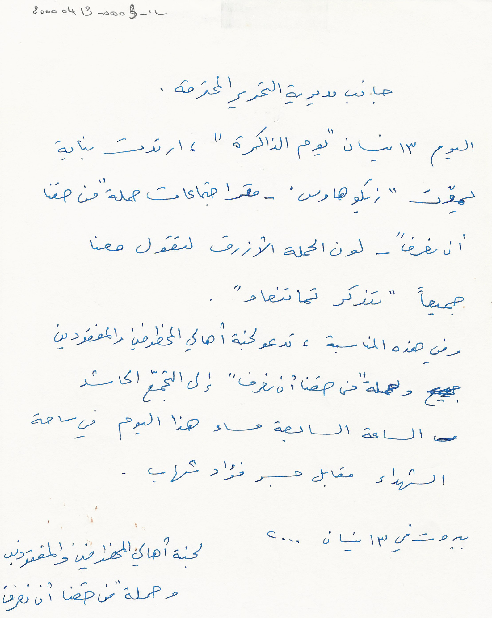 دعوة الى تجمع في ساحة الشهداء، 13 نيسان : يوم الذاكرة