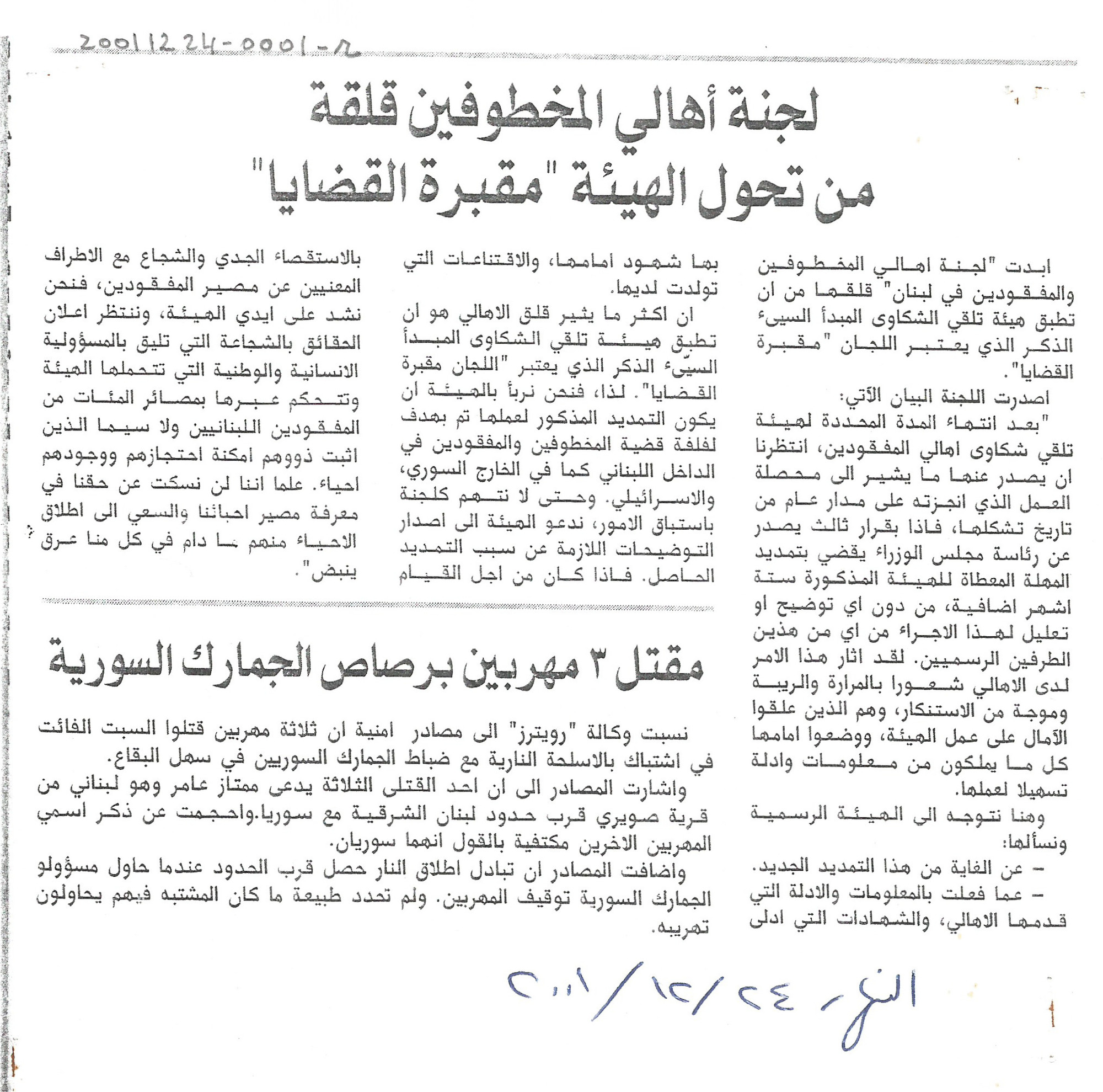 - ar لجنة اهالي المخطوفين قلقة من تحول الهيئة الى مقبرة القضايا