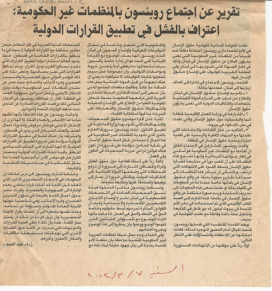 - ar تقرير عن اجتماع روبنسون بالمنظمات غير الحكومية: اعتراف بالفشل في تطبيق القرارات الدولية
