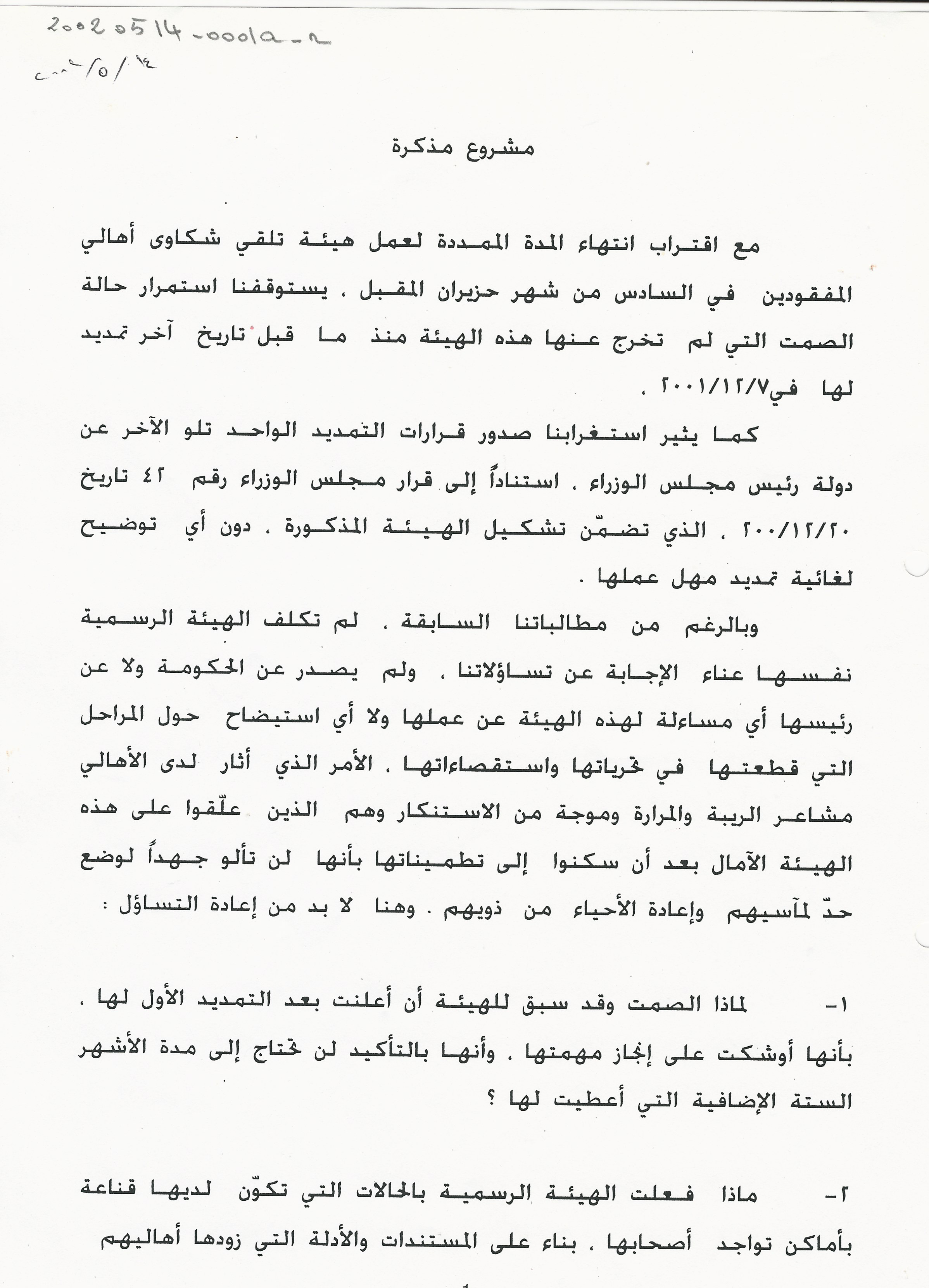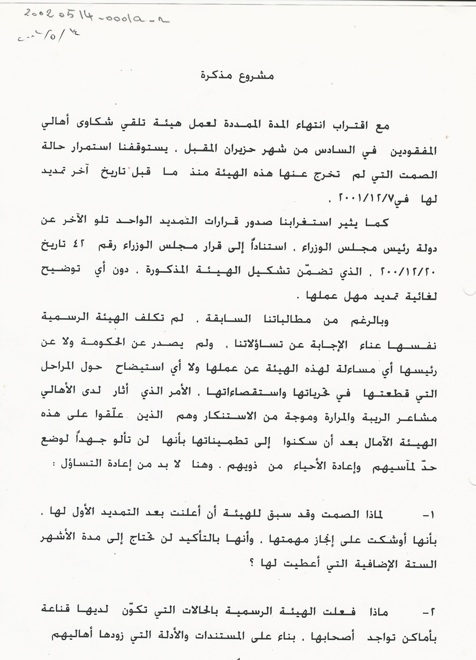 مشروع مذكرة لجنة الاهالي يتعلق بنتائج عمل هيئة تلقي شكاوى اهالي المفقودين