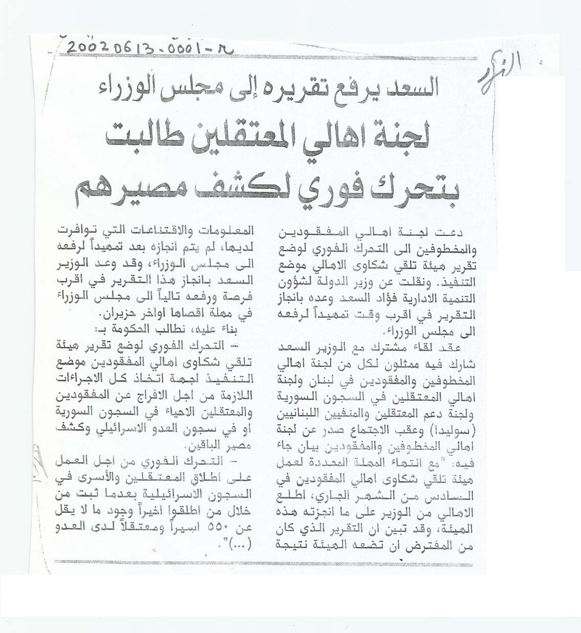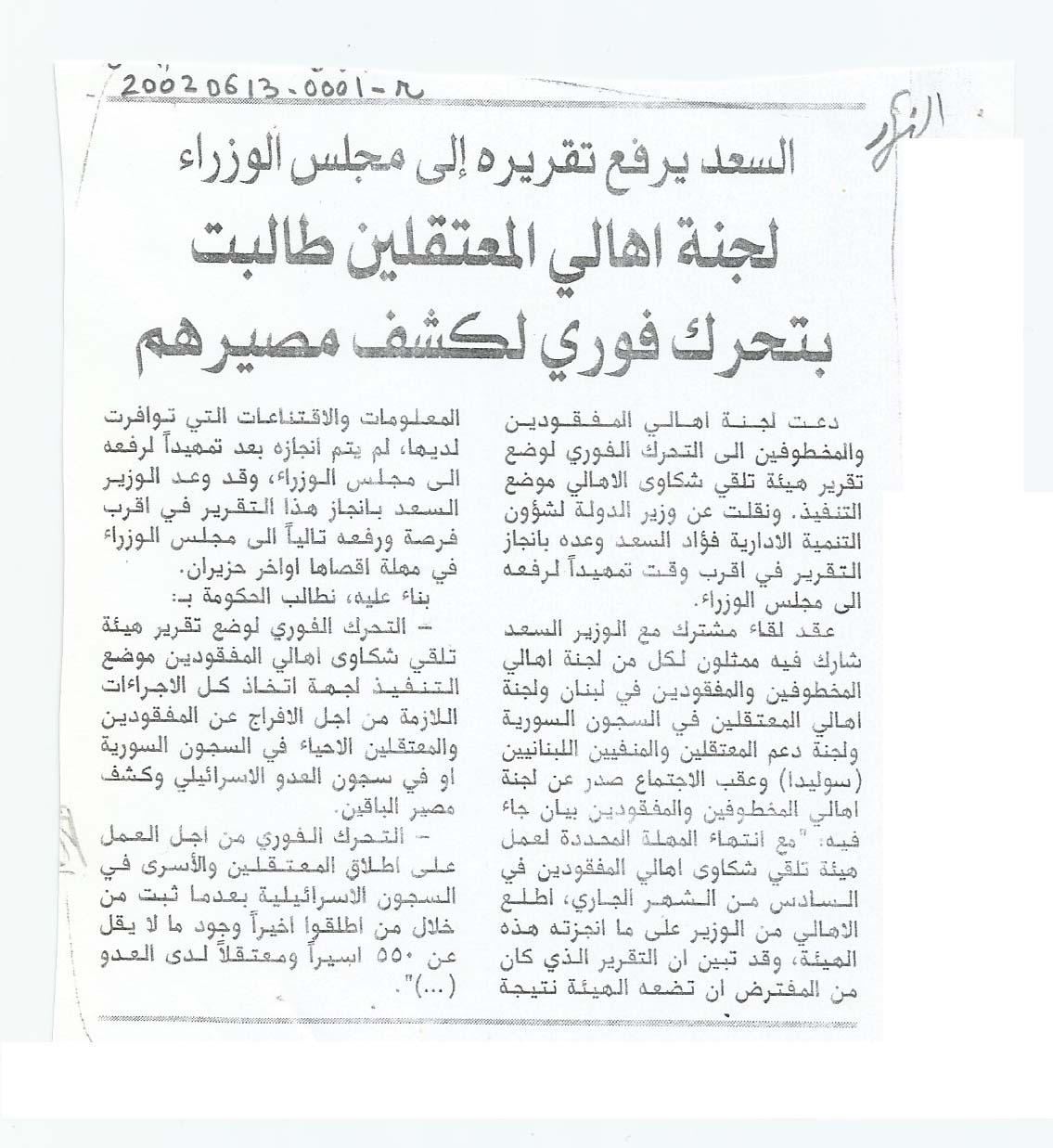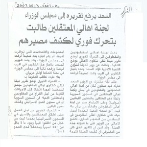 لجنة اهالي المعتقلين طالبت بتحرك فوري لكشف مصيرهم، السعد يرفع تقريره الى مجلس الوزراء