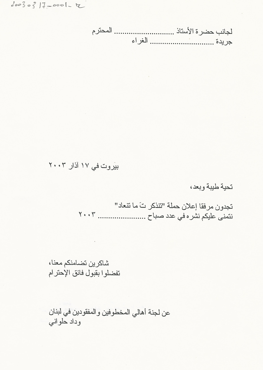 طلب نشر اعلان لحملة تنذكر ت ما تنعاد