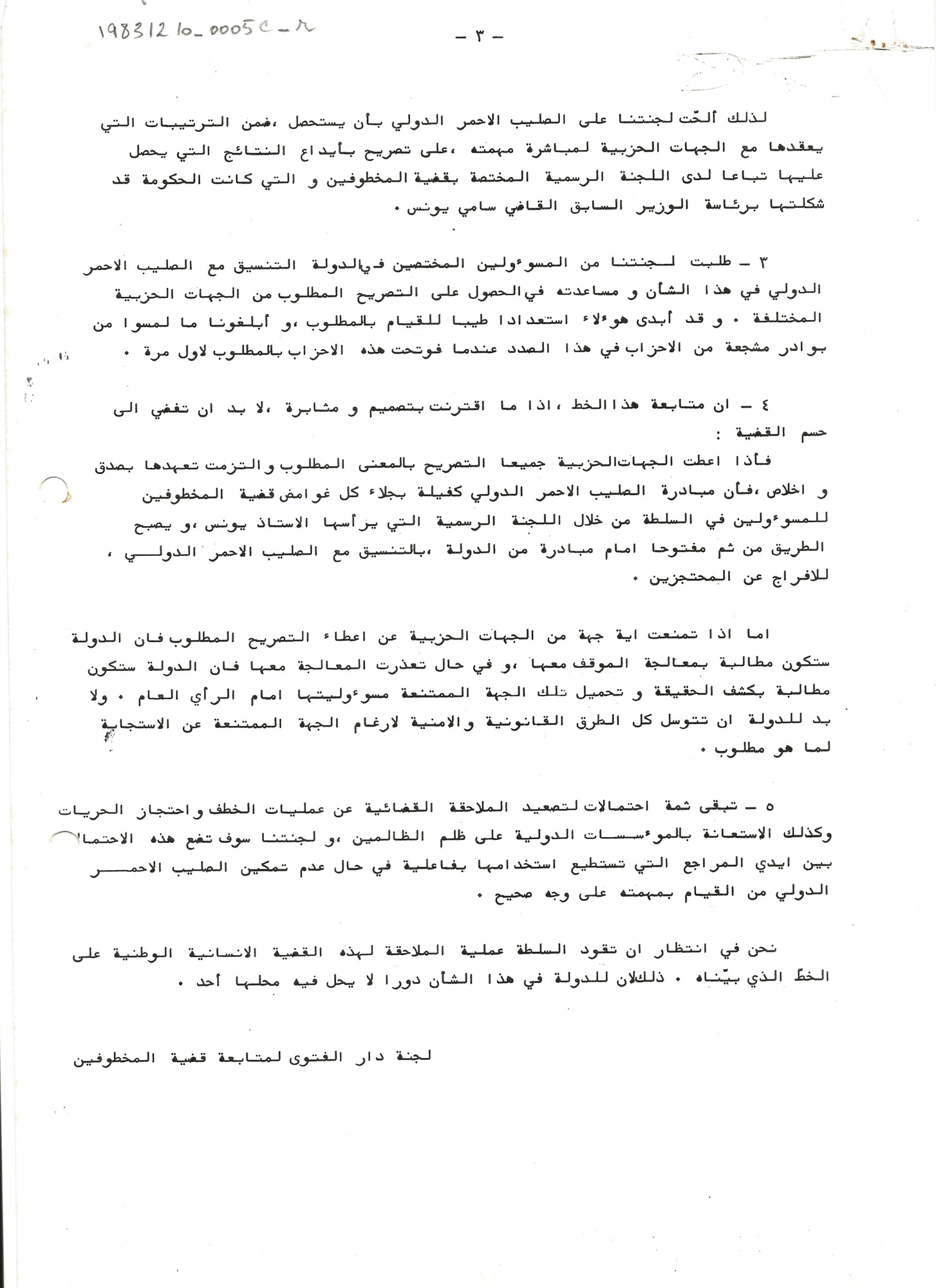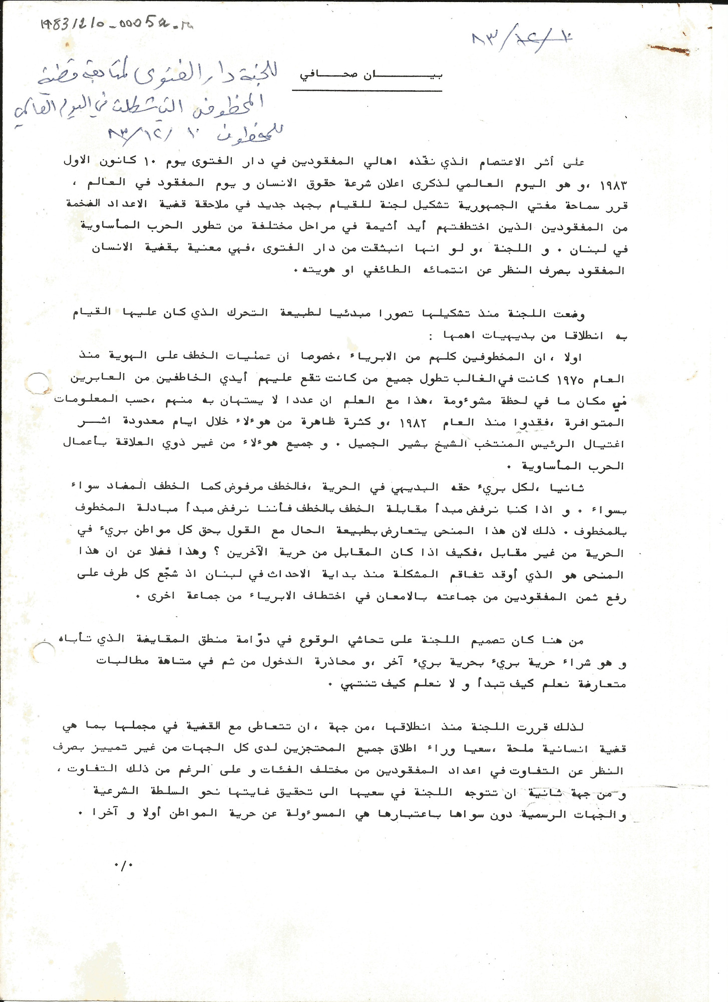 بيان صحافي للجنة دار الفتوى لمتابعة قضية المفقودين التي شكلت في اليوم العالمي للمخطوف