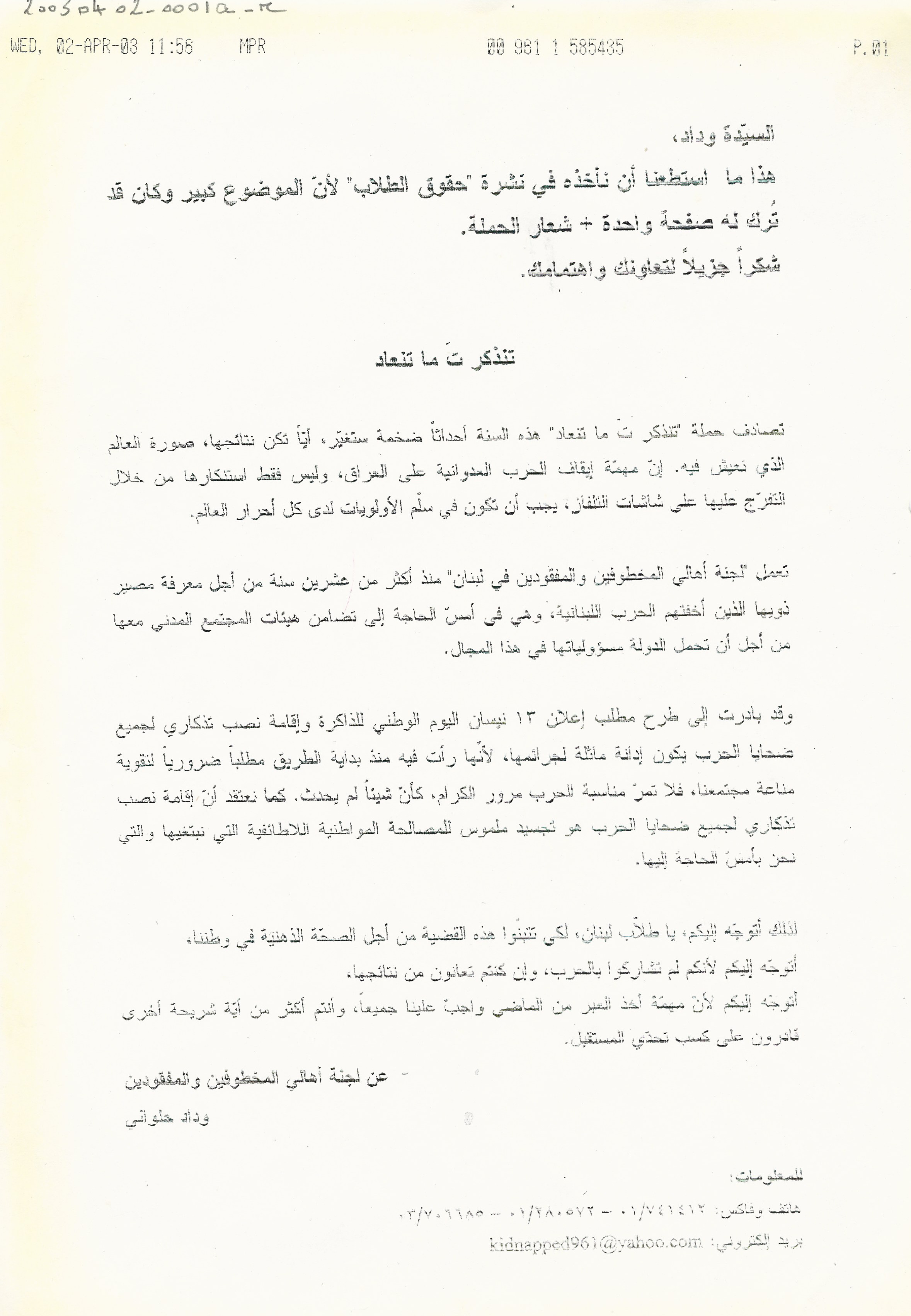 - ar رسالة حملة تنذكر تما تنعاد (حقوق الطلاب)