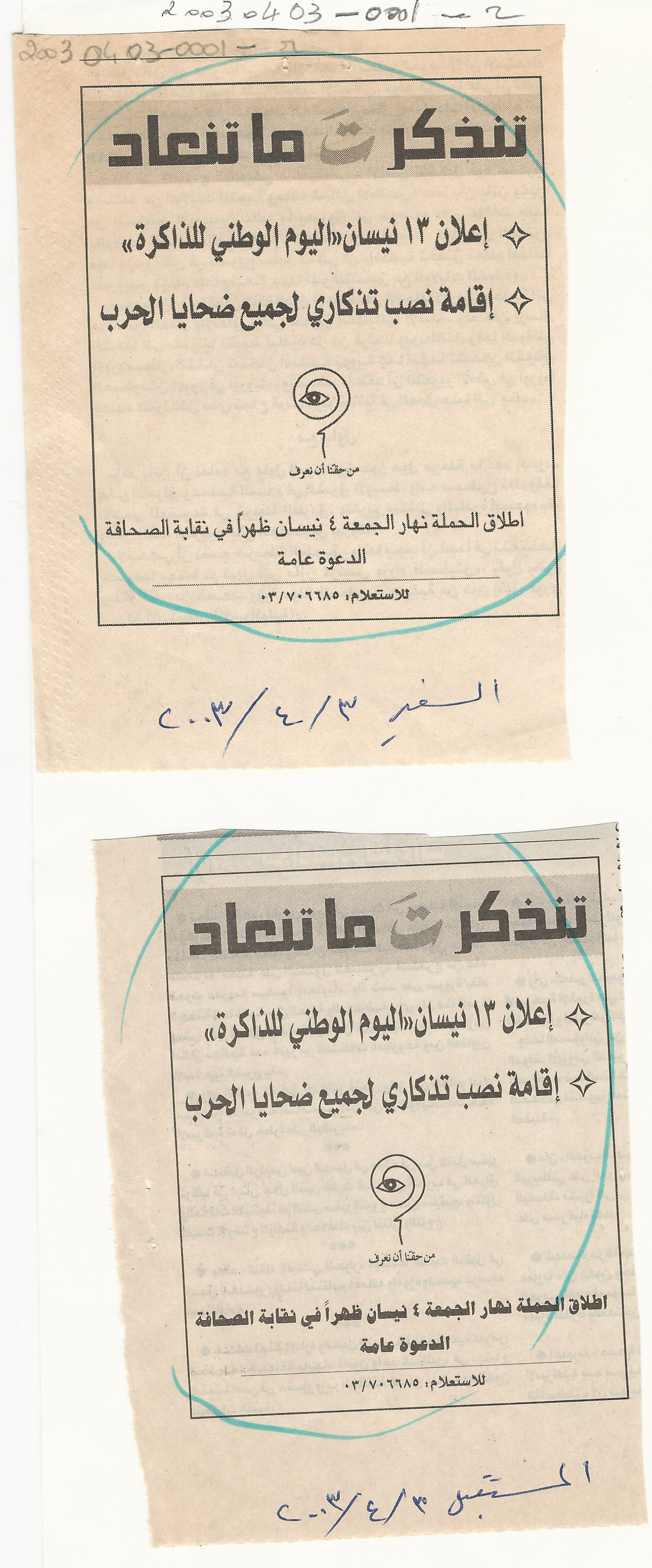 - حملة تنذكر تـ ما تنعاد، 2003