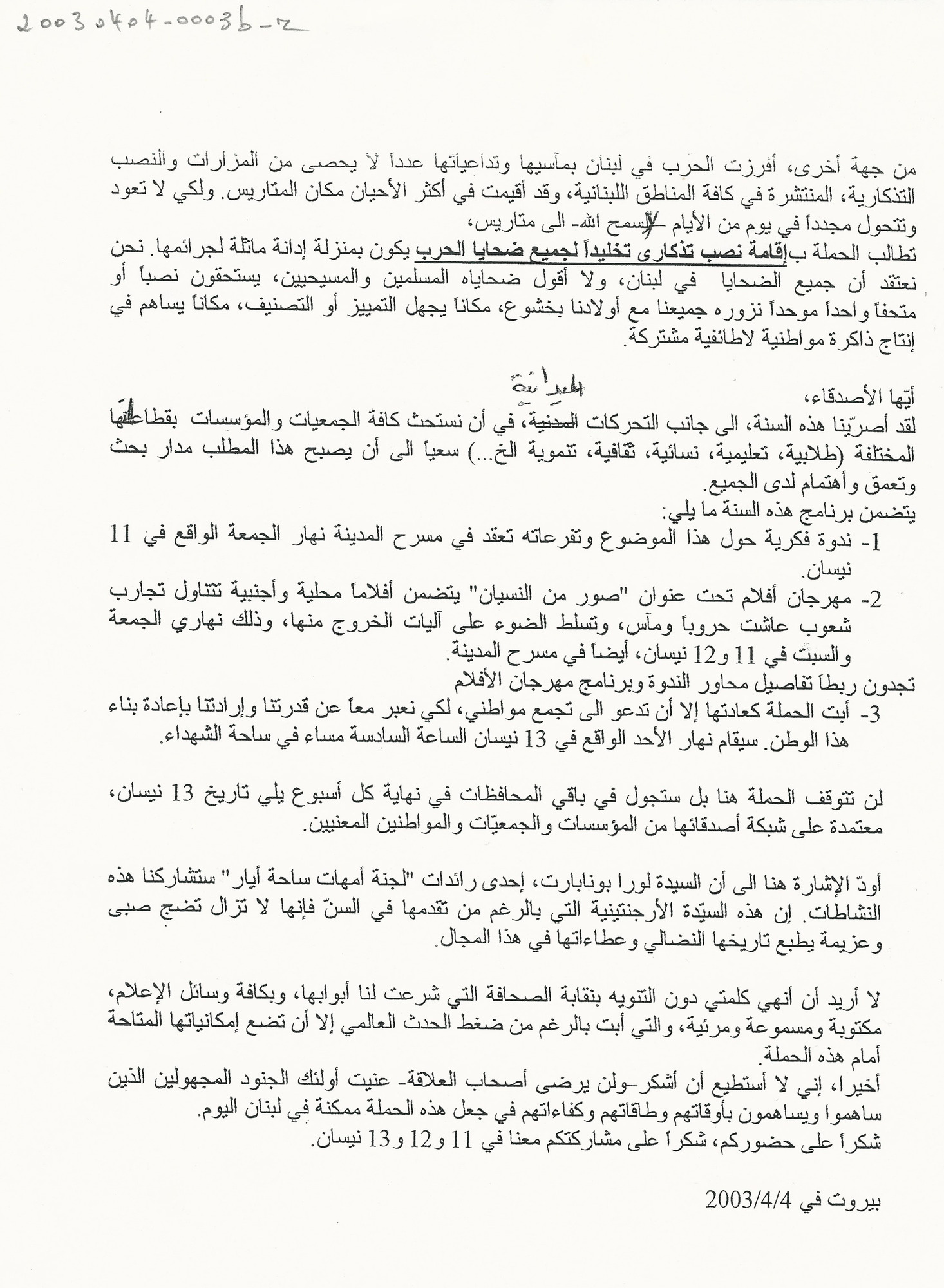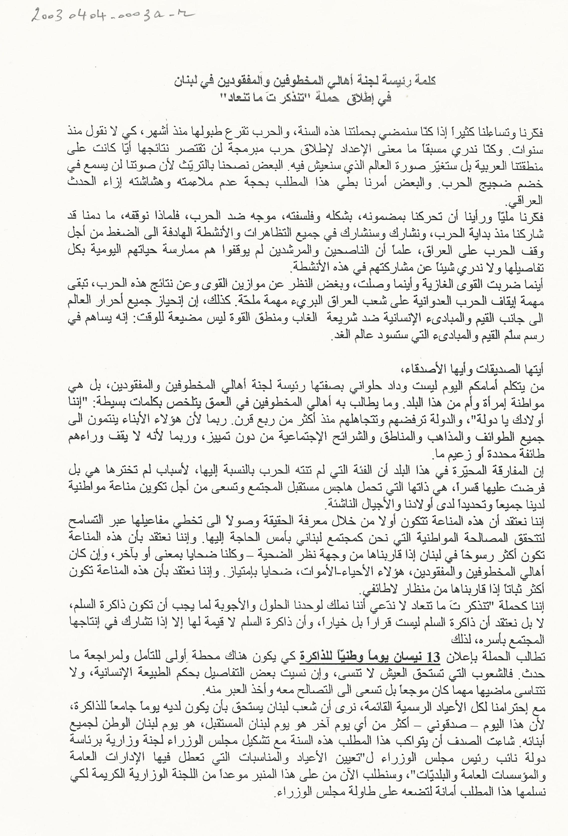 The address of the president of the Committee of the Families of the Kidnapped and Missing in Lebanon on the launching of the “May it be remembered and so not repeated” campaign