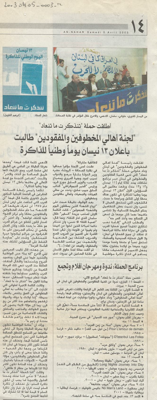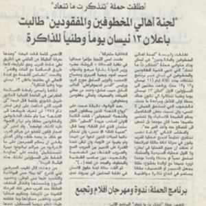 The Committee of the Families of the Kidnapped and Missing demanded the declaration of April 13 a national day for memory, and launched the campaign of “May it be remembered and so not repeated.”