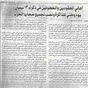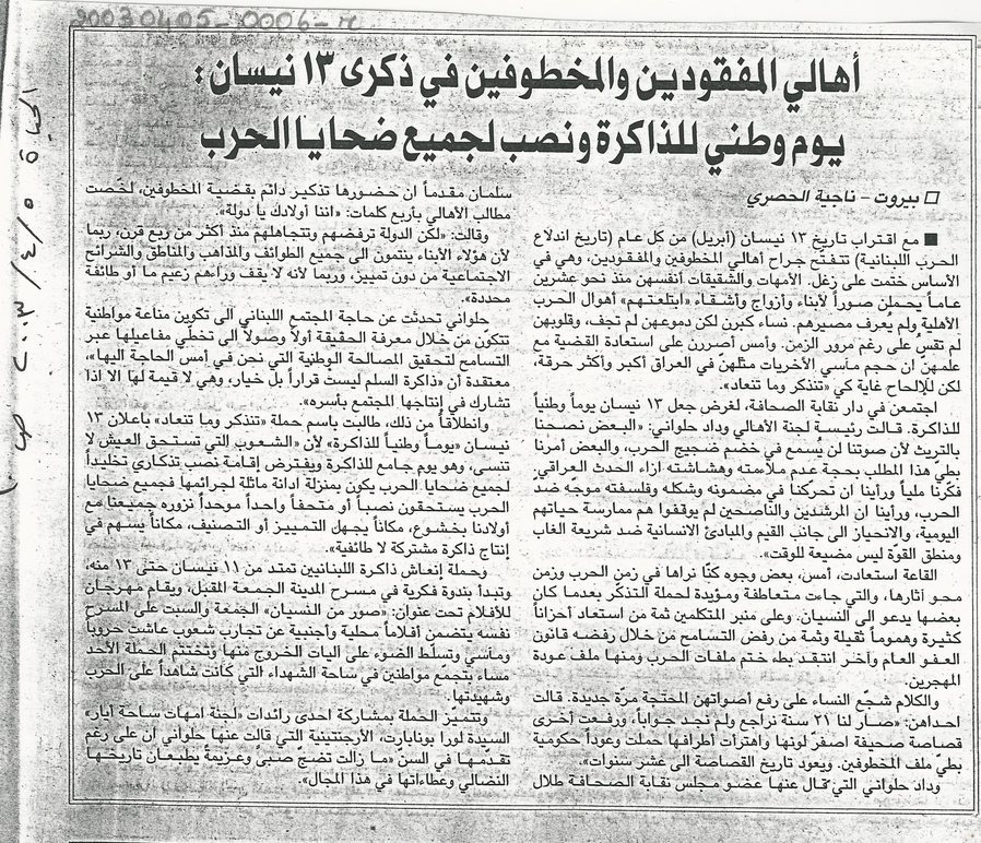 اهالي المفقودين والمخطوفين في ذكرى 13 نيسان: يوم وطني للذاكرة ونصب لجميع ضحايا الحرب
