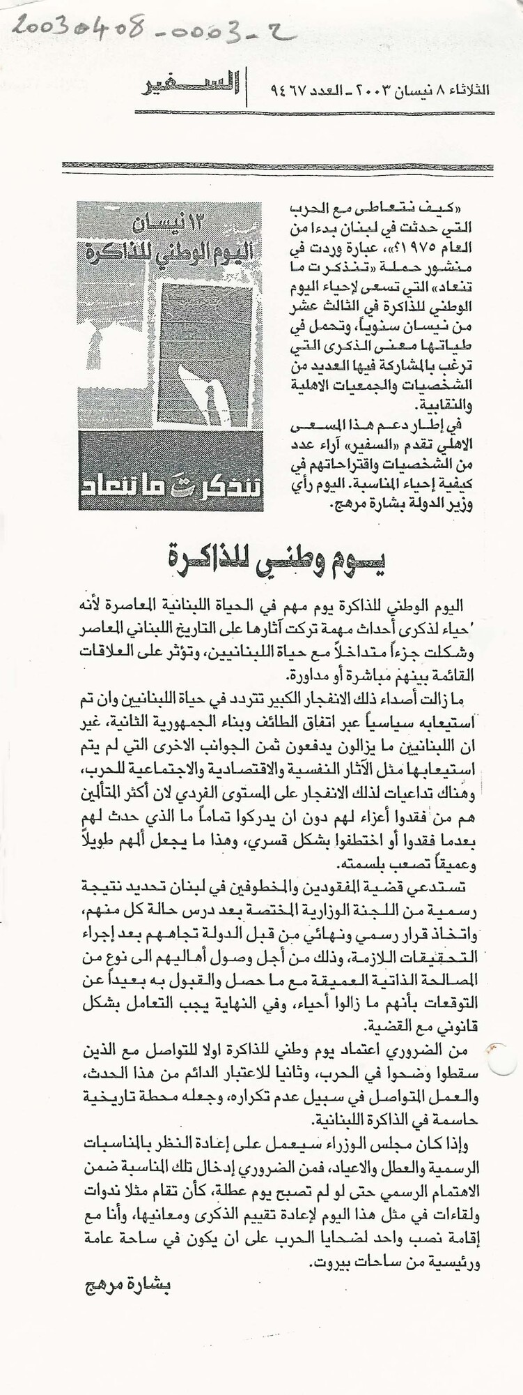 - ar يوم وطني للذاكرة : نص بشارة مرهج